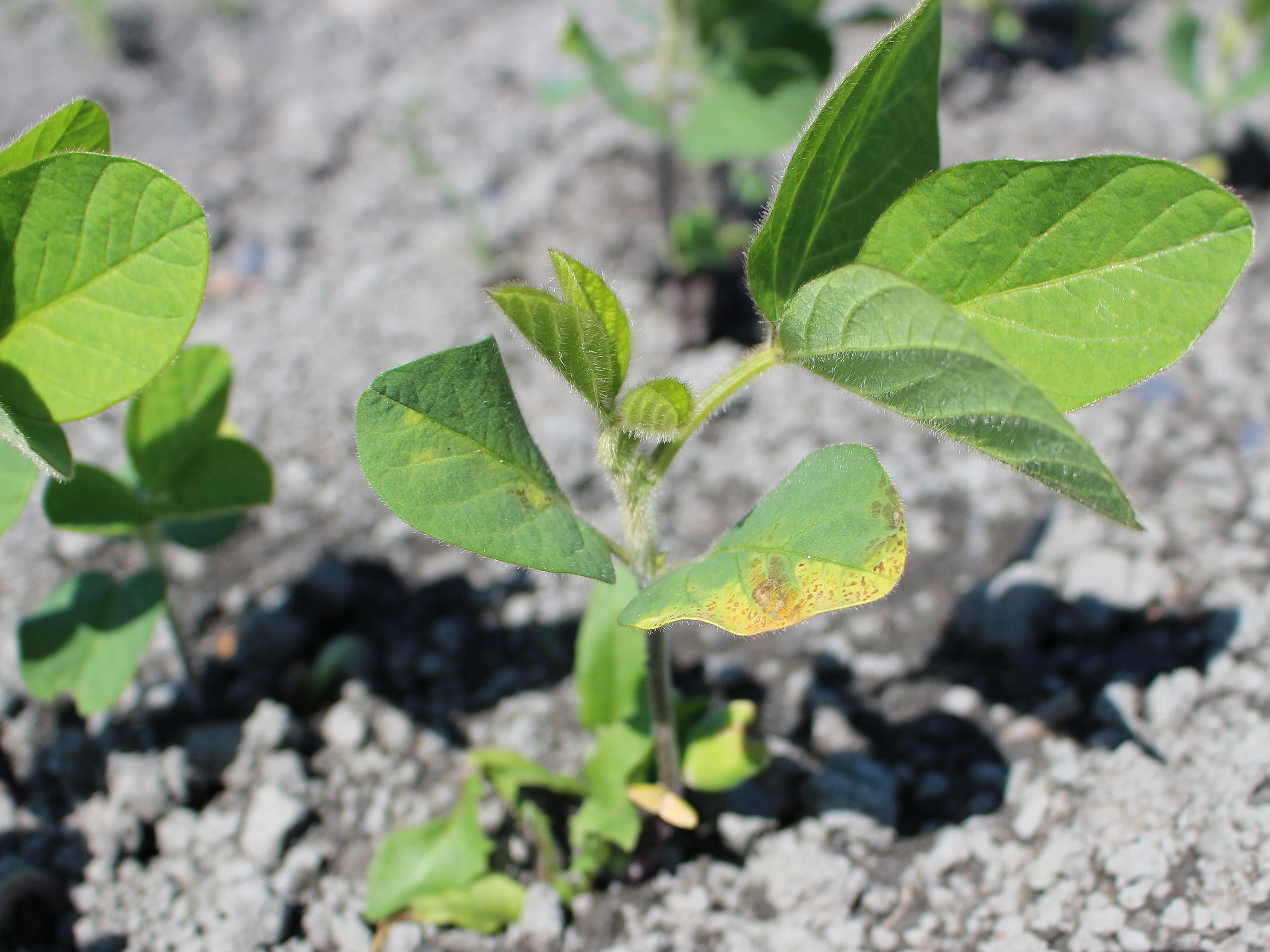 Une plantule de soya montre un jaunissement de la feuille basale, qui débute à l’apex et progresse vers le limbe. Le symptôme est attribuable à l’application en prélevée de SENCOR® 75 DF, à 200% de la dose recommandée. L’étiquette du produit mentionne que les traitements utilisant des doses supérieures à celles recommandées peuvent causer des brûlures, un jaunissement ou un rabougrissement de la culture. De fortes pluies, survenant peu de temps après le traitement, peuvent aussi endommager la culture, en particulier dans les zones mal égouttées où l’eau peut stagner plusieurs jours.