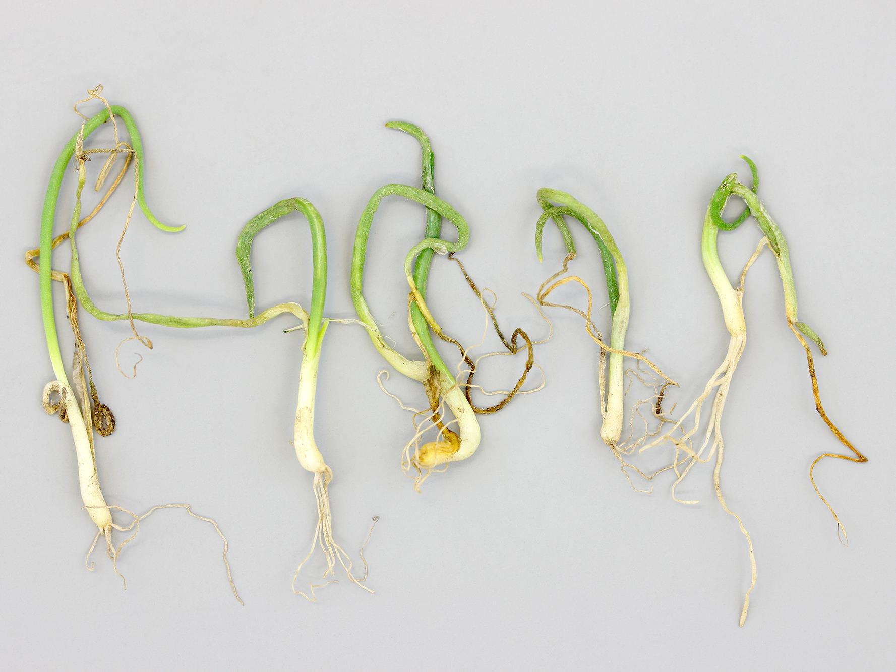 Les plantules d'oignon sec provenant d’un champ présentent de sévères malformations au niveau des feuilles et du collet. Les feuilles sont enroulées en spirale ou en forme de crochet. Quant à lui, le collet est soit gonflé ou recourbé. La taille des plants est également réduite. Les dommages observés sont attribuables à une phytotoxicité par l’herbicide FRONTIER MAX (diméthénamide-P) appliqué trop tôt en saison (en préémergence). Au champ, plus de 75 % des plants sont affectés.