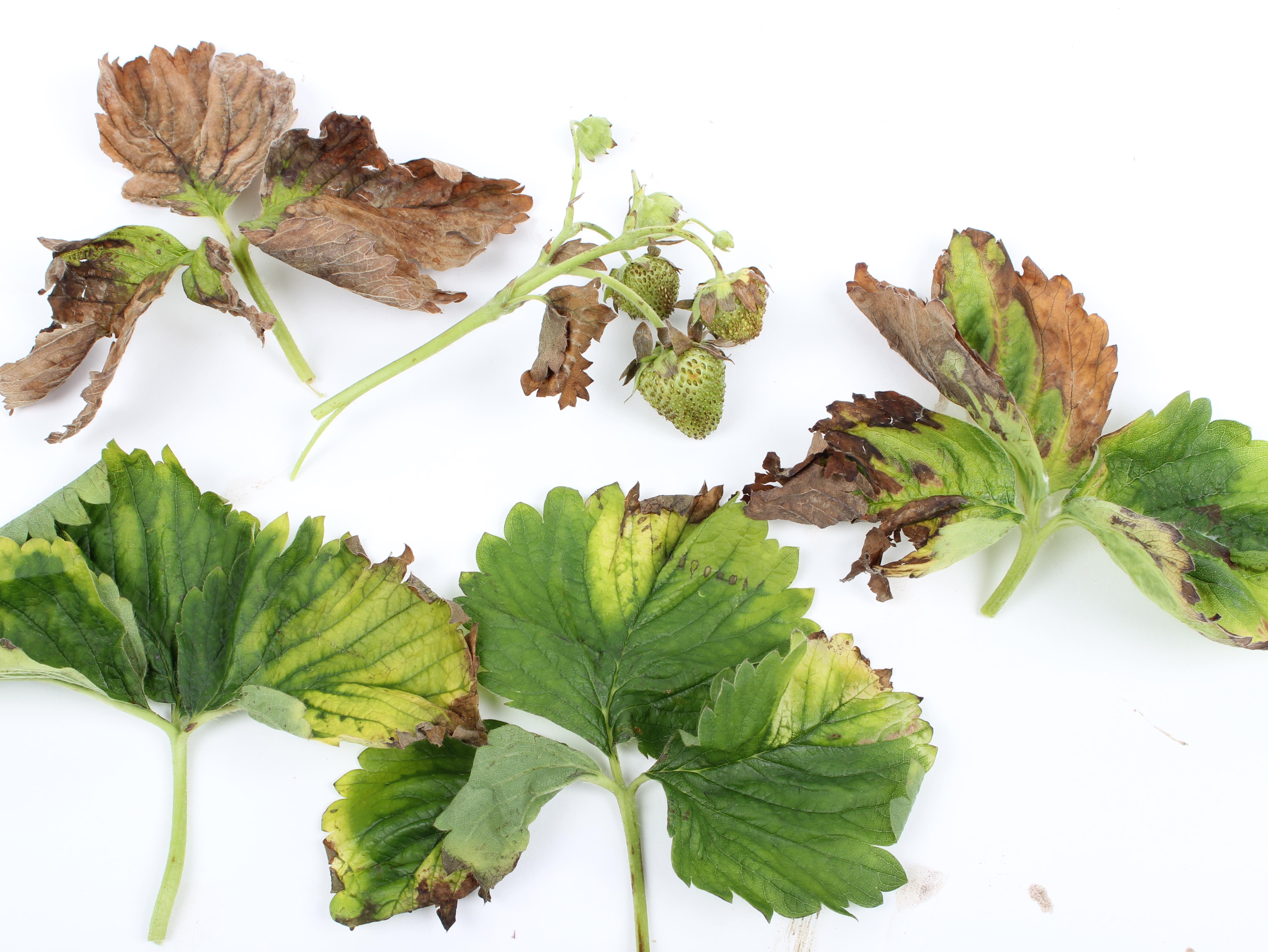 Les feuilles et les sépales des fruits présentent des brûlures. Une chlorose prononcée, voire un blanchiment, est aussi présente sur les feuilles. Un dosage chimique a révélé une quantité assez élevée de métribuzine (SENCOR) dans l'échantillon soumis. Les dommages observés résultent d'une phytotoxicité par ce produit. Il est à noter que d'autres herbicides ont été détectés : l'atrazine et son métabolite de décomposition (le déséthyl-atrazine) se retrouvent aussi à un niveau pouvant causer des dommages, surtout additionnés à la métribuzine, de la même famille chimique. La métribuzine et l'atrazine ne sont pas homologuées dans la culture de la fraise. Les dommages sont identiques pour ces deux produits. Les autres molécules retrouvées sont à un niveau qui ne semble pas causer de phytotoxicité sauf pour la mésotrione, à l'origine des symptômes de blanchiment observé sur les feuilles.