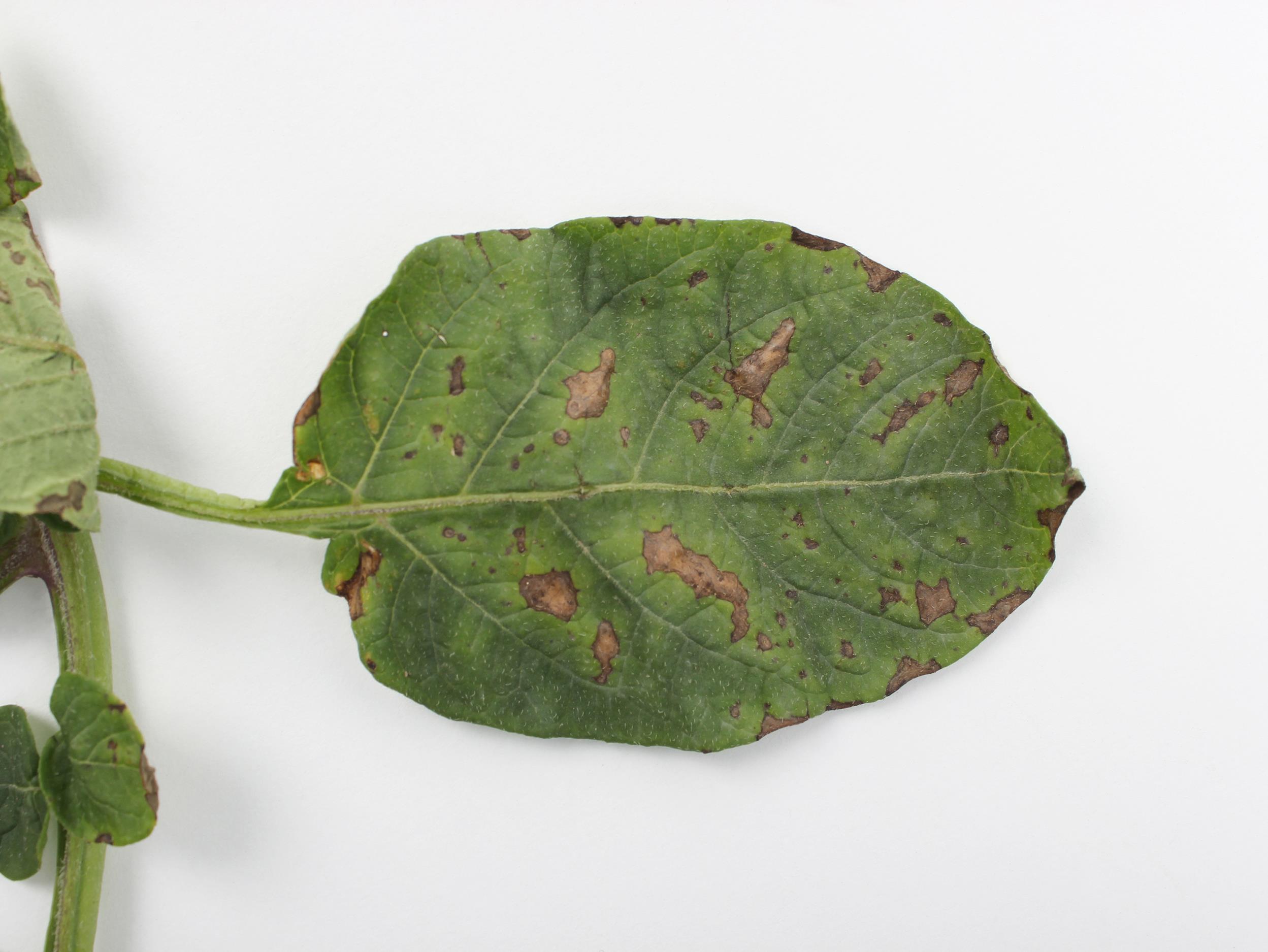 Taches brunes et brûlure marginale sur foliole de pomme de terre