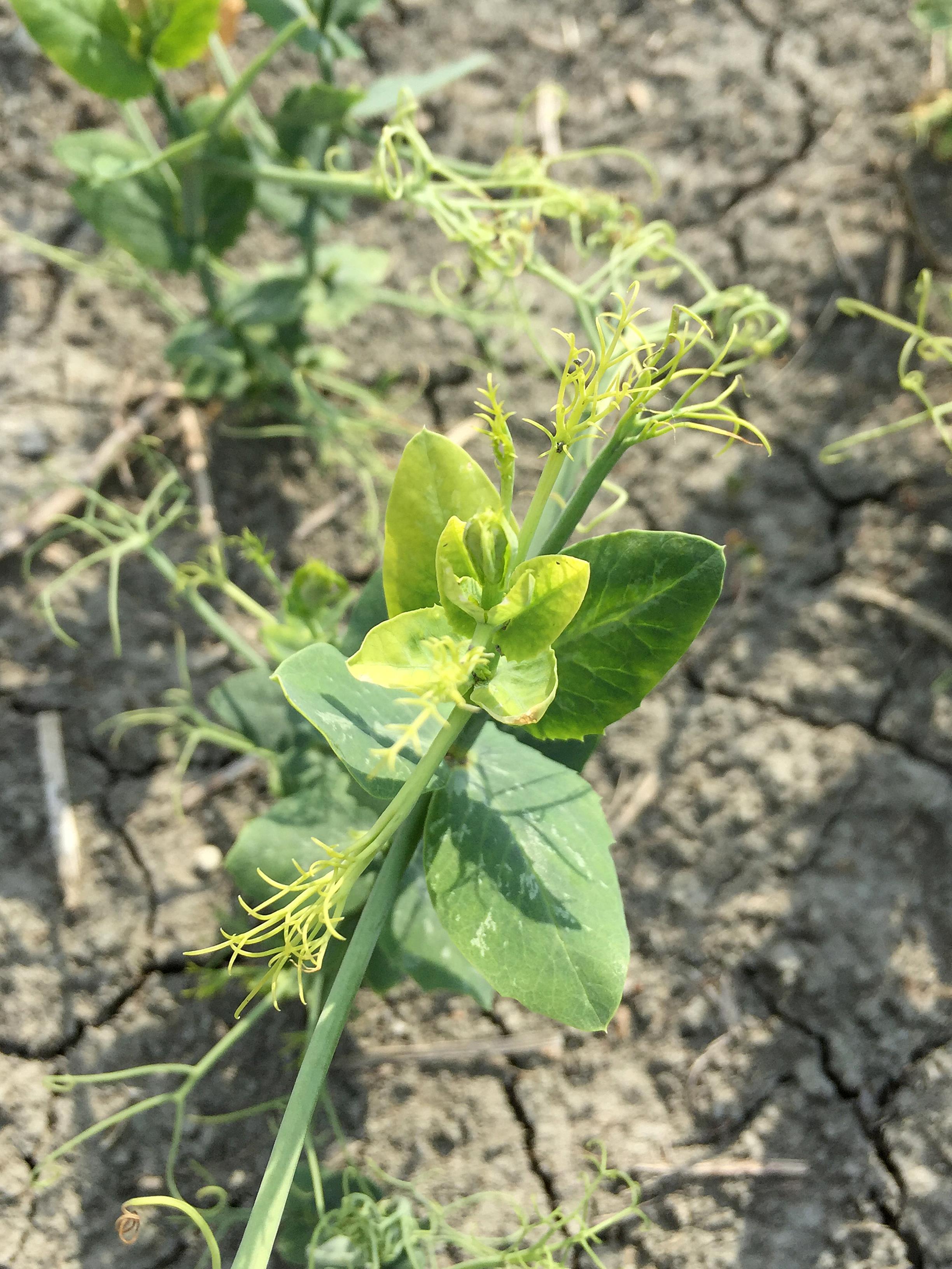 Les feuilles terminales d'un plant de pois (de transformation) présentent un jaunissement à un blanchiment des tissus. Ce symptôme est attribuable à l'application de ROUNDUP WEATHERMAX (glyphosate), à 148% de la dose, dans la parcelle. Les plus jeunes feuilles sont les premières à être affectées. Les symptômes apparaissent dans un délai de 10 à 14 jours suivant l'application. Des malformations au niveau des feuilles peuvent aussi être observées.