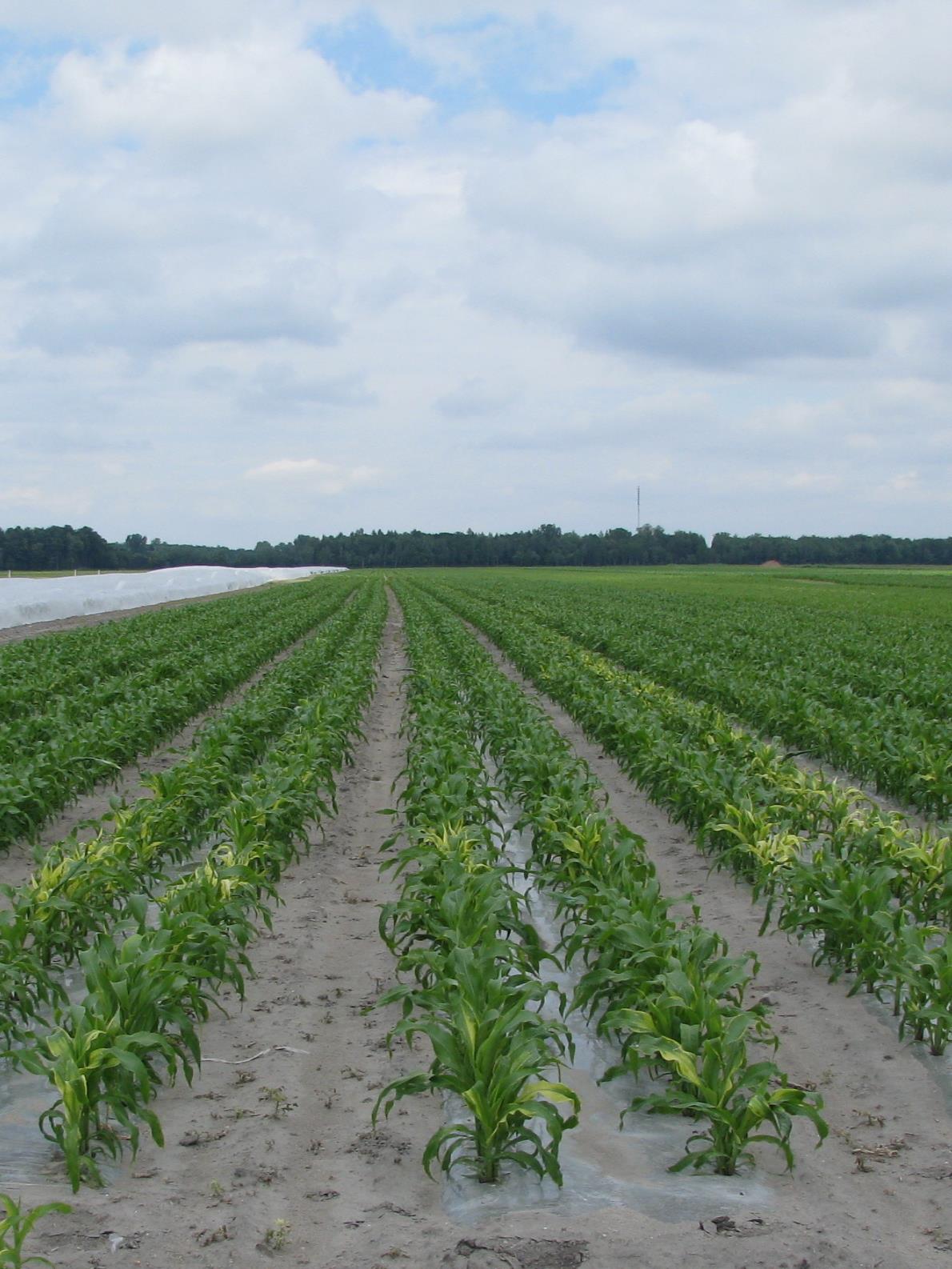 Une décoloration à la marge des feuilles et fréquemment sur la presque totalité du limbe des feuilles médianes et terminales est présente sur des plants de maïs sucré. Ce symptôme est généralisé à l’ensemble du champ et est apparu suite à la pulvérisation de l’herbicide IMPACT® (topramezone) avec atrazine (AATREX liquide 480) et fertilisation azotée (28-0-0), une semaine auparavant. Les doses appliquées étaient conformes à celle de l’étiquette. Cette dernière mentionne d’ailleurs que la tolérance aux herbicides des cultivars de maïs sucré peut varier, y compris avec l'herbicide IMPACT® (topramezone) avec atrazine. Le symptôme observé sur les plants est typique de ceux notés avec les herbicides du groupe 27. Il serait aussi temporaire et les plants reprendraient leur apparence normale dans les semaines suivantes. Les feuilles basales ne présentent pas ce symptôme. Les mauvaises herbes montrent des symptômes similaires.