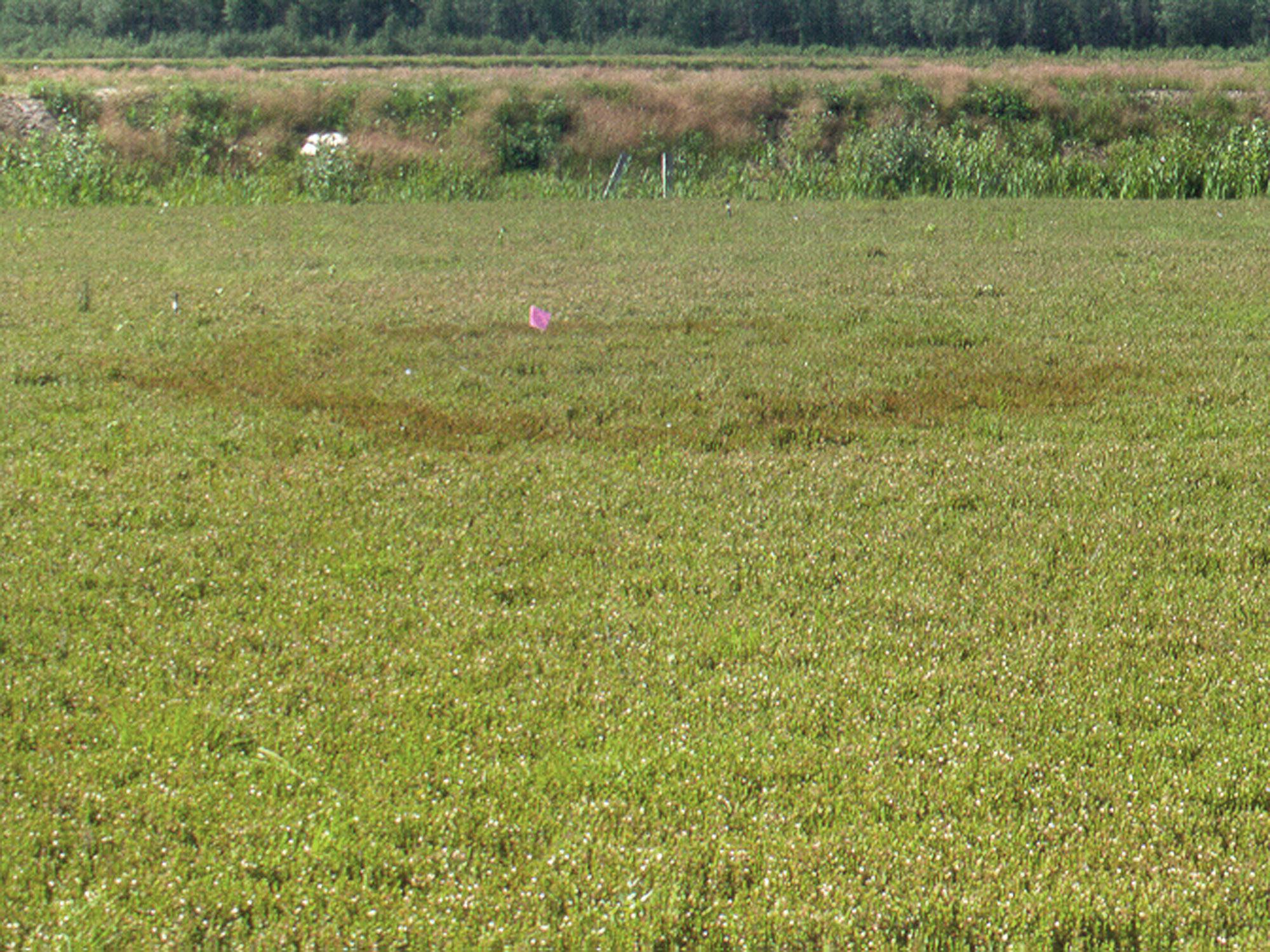 Zone brune constituée de plants de canneberge avec un apex brun