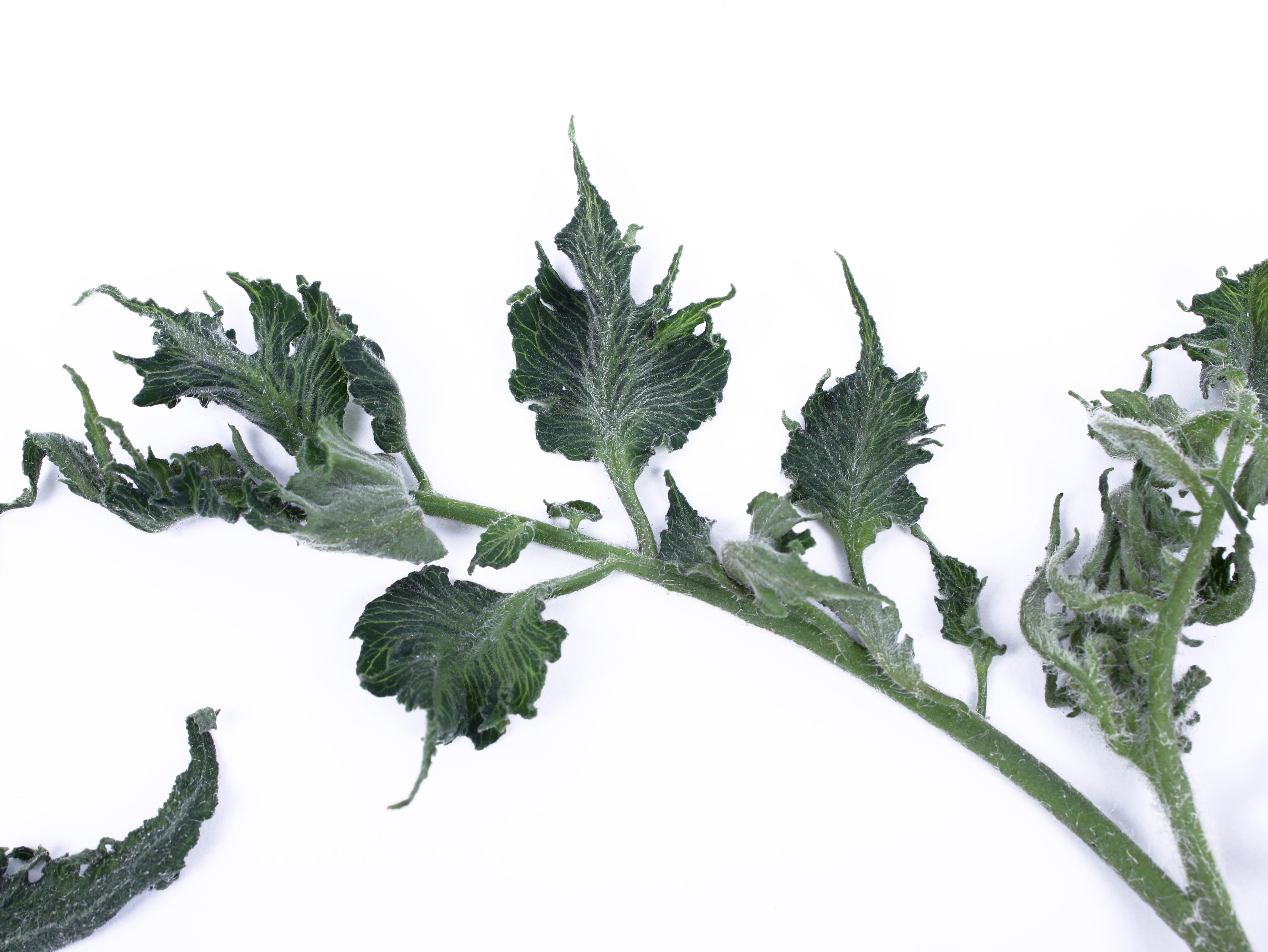 Sur un jeune plant de tomate de serre, les feuilles terminales sont très affectées. Elles sont enroulées en forme de cuillère, peu développées, avec une marge dentelée et des nervures parallèles. Les tiges secondaires sont très longues et il y a une perte de dominance apicale (non visible ici). Les tests de laboratoire se sont avérés négatifs pour la détection de virus et de phytoplasme. Il pourrait s’agir d’une phytotoxicité liée à un herbicide du groupe 4 comme le 2,4-D.