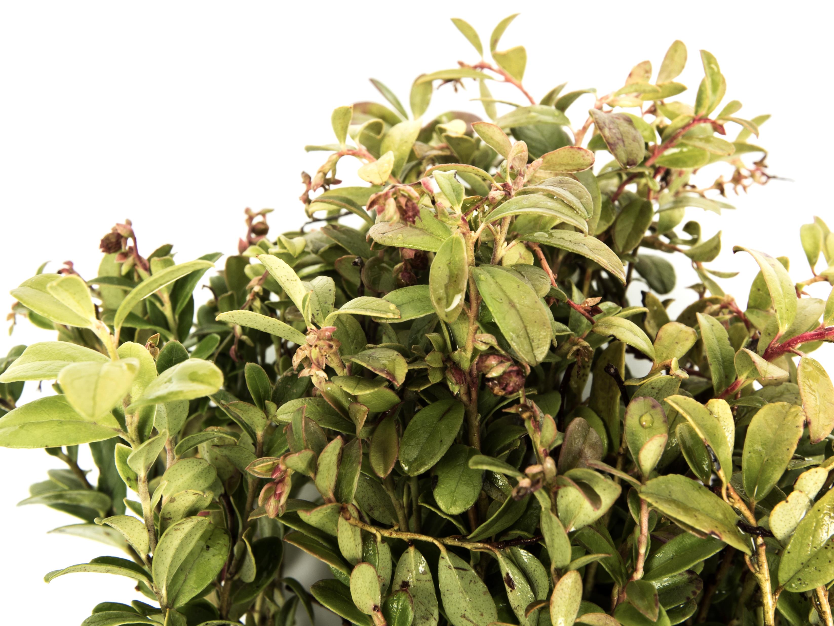 Plusieurs feuilles terminales d'un plant d’airelle rouge présentent un jaunissement et/ou une coloration rosée des tissus. Ce symptôme est attribuable à une dérive de glyphosate. Les plus jeunes feuilles sont les premières à être affectées. Les symptômes apparaissent dans un délai de 10 à 14 jours, suivant l'application. Le dosage chimique a révélé la présence de résidus de glyphosate dans la plante à une concentration faible mais suffisante pour provoquer les symptômes observés.