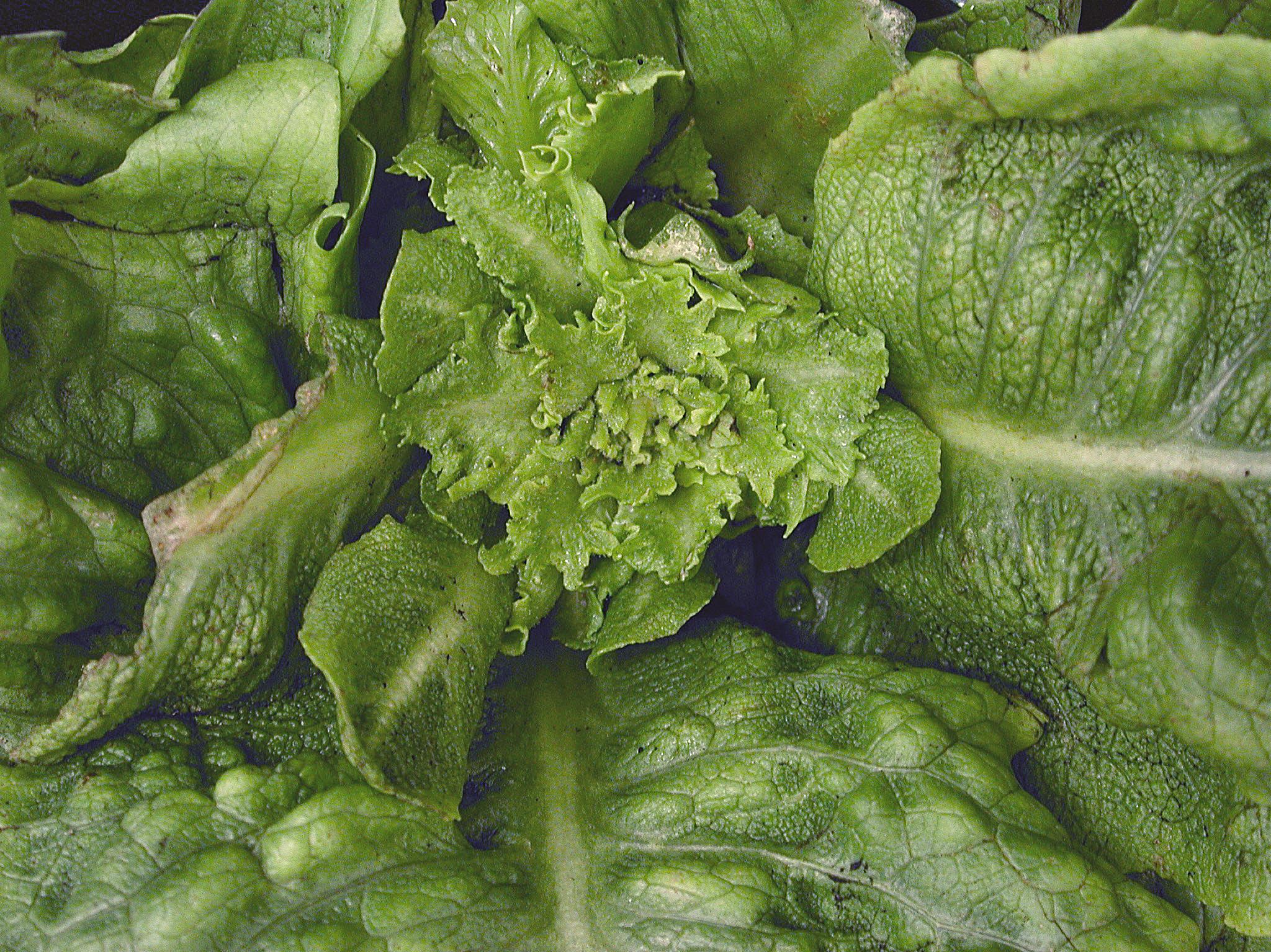 Les feuilles terminales d'un plant de laitue de variété romaine présentent des malformations: celles-ci sont rabougries, atrophiées, dures et cassantes, et les tissus sont gaufrés. Il y a aussi présence de petits plants au niveau du collet (non visible ici). Les résultats des tests pour les virus sont négatifs. Le diagnostic conclut en une phytotoxicité causée par la dérive d'un herbicide phytohormonal (2,4-D ou MCPA). Dans le même champ, la laitue de variété Boston présente les mêmes symptômes.