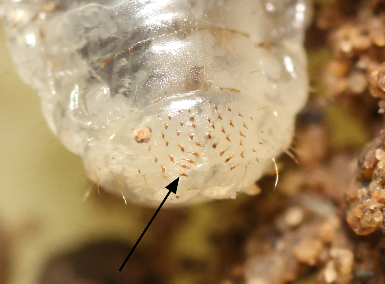Chez les larves du scarabée japonais, les rangées d'épines présentes sur la section ventrale du dernier segment abdominal (raster) sont disposées en "V". Cette caractéristique permet de différ
