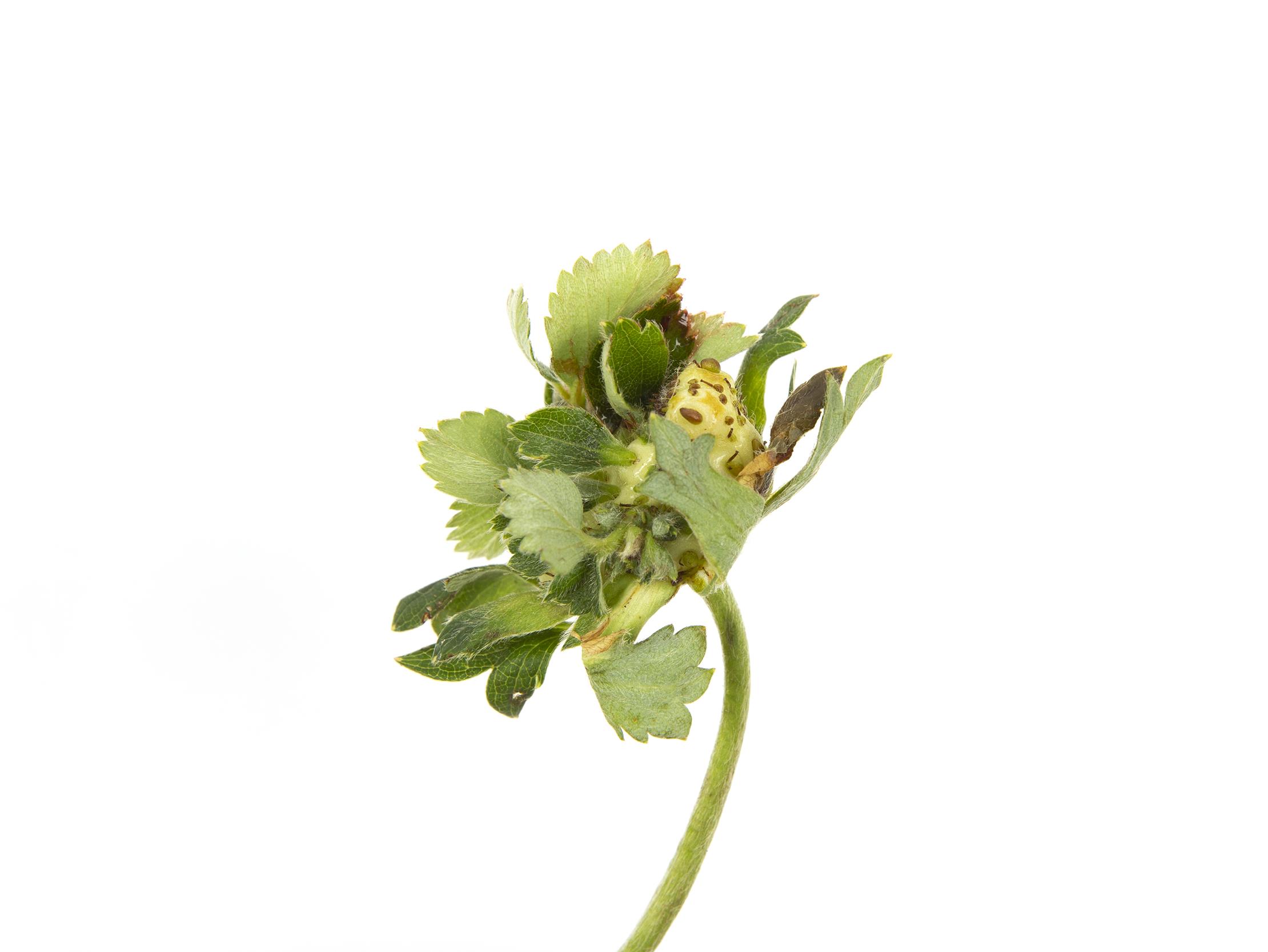 La fraise (cv 'Malwina') est déformée et l’on observe une croissance foliacée à partir des akènes du fruit. Ces malformations sont des symptômes caractéristiques du phytoplasme de la jaunisse de l’aster chez le fraisier. Les tests en laboratoire ont révélé la présence d’un phytoplasme dans cet échantillon.
