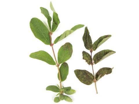 La tige d'un plant de camérisier, à gauche sur l'image, montre des feuilles dont le degré de dommage est beaucoup moins sévère que celles de la tige située à droite. Les feuilles touchées de cette dernière tige montrent des taches sans halo (brûlures de contact), distribuées aléatoirement sur le limbe et visibles sur la face inférieure. Elles sont diffuses à certains endroits et plus prononcées à d'autres. Ce symptôme a été causé par l’application de bromoxynil (ester) à proximité des camérisiers (dérive de produit). Cet herbicide de contact est entre autres utilisé pour éliminer les feuilles larges dans les céréales et le maïs et n'est pas homologué pour la culture des petits fruits, dont celle de la camerise. Le dosage chimique réalisé a montré la présence de l’herbicide à une faible concentration, toutefois suffisante pour causer des dommages. La brûlure évolue en nécrose sur les tissus atteints mais les nouvelles feuilles ne sont pas affectées. L'herbicide ne migre pas dans la plante; les brûlures n’apparaissent que sur les parties touchées.