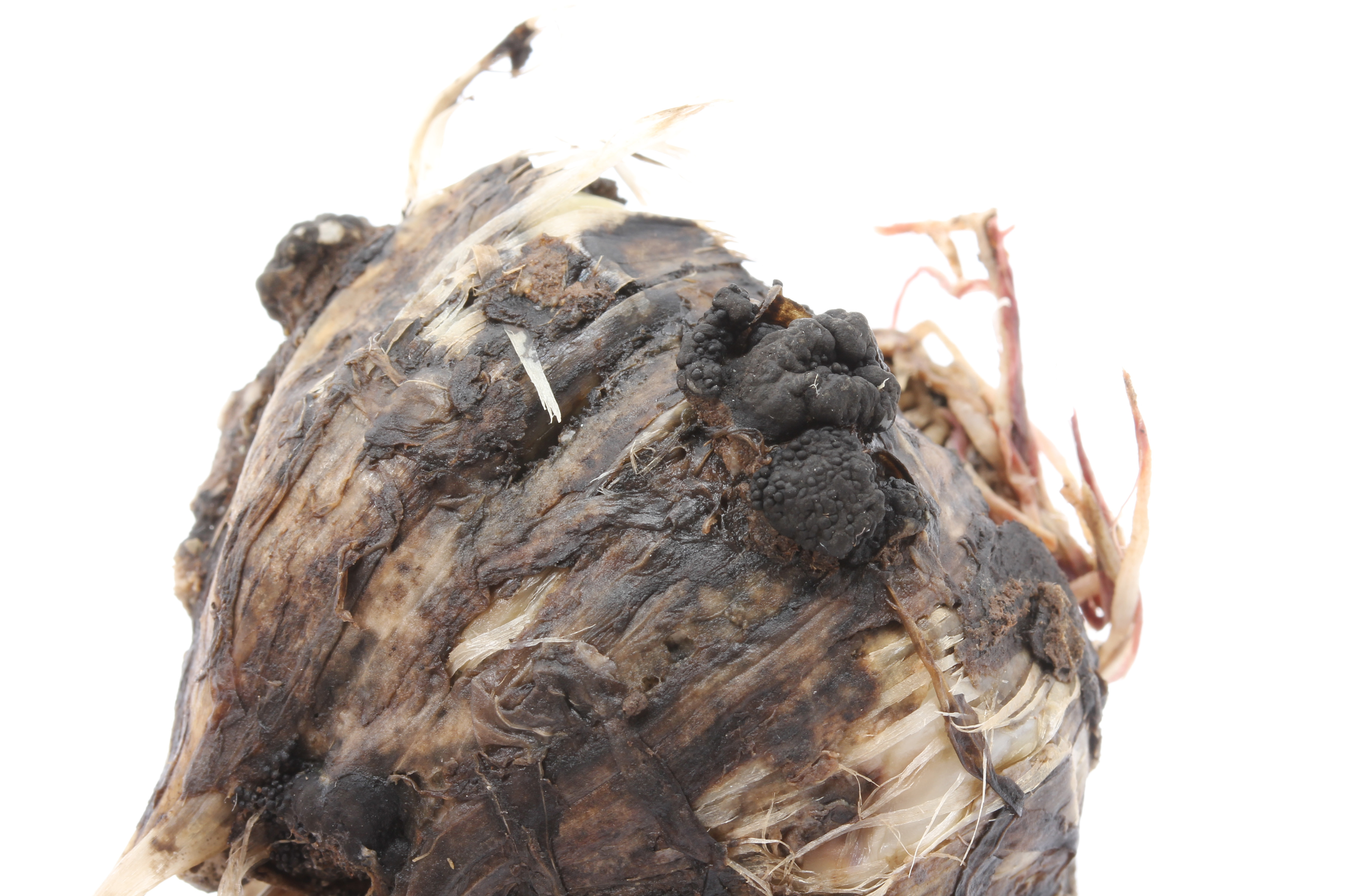 Sur ce bulbe d'ail fortement affecté par la pourriture blanche, on observe la présence de larges sclérotes noires. Ces structures bosselées et dures sont formées de mycélium compact et permettent à Sclerotium cepivorum de survivre dans le sol de nombreuses années.