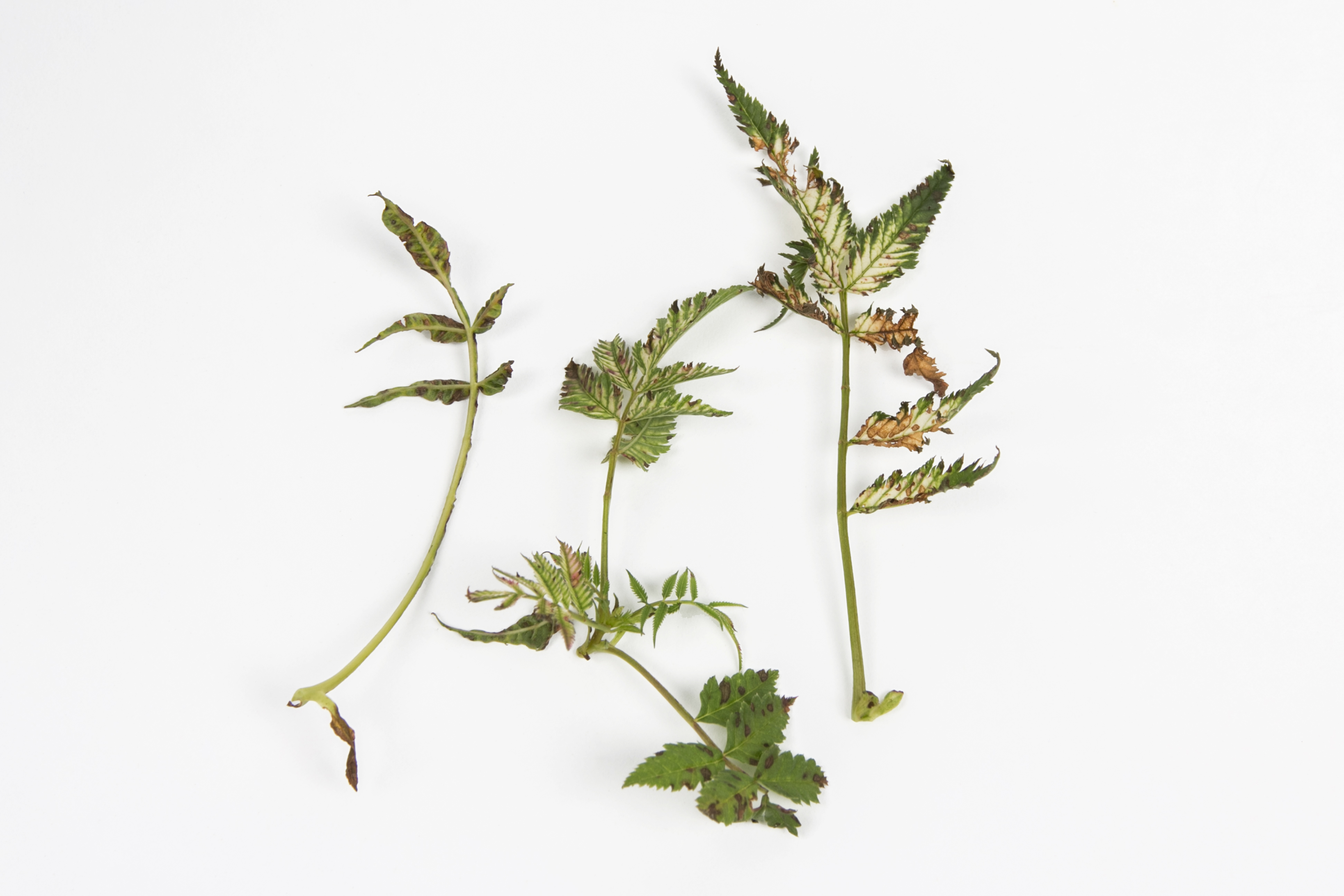 Les feuilles d'un plant de fausse-spirée à feuilles de sorbier sont décolorées, voire presque blanchies, mais les nervures demeurent vertes. Une coloration rosée du limbe est aussi apparente. Des brûlures sont aussi présentes à la marge de plusieurs folioles. Environ 80% des plants dans la pépinière montrent ces symptômes. Aucun phytoplasme n’a été détecté dans les tissus symptômatiques. Un dosage chimique a cependant révélé une concentration élevée de glyphosate, amplement suffisante pour affecter la plante. Une dérive d’un champ voisin serait à l’origine de cette phytotoxicité.