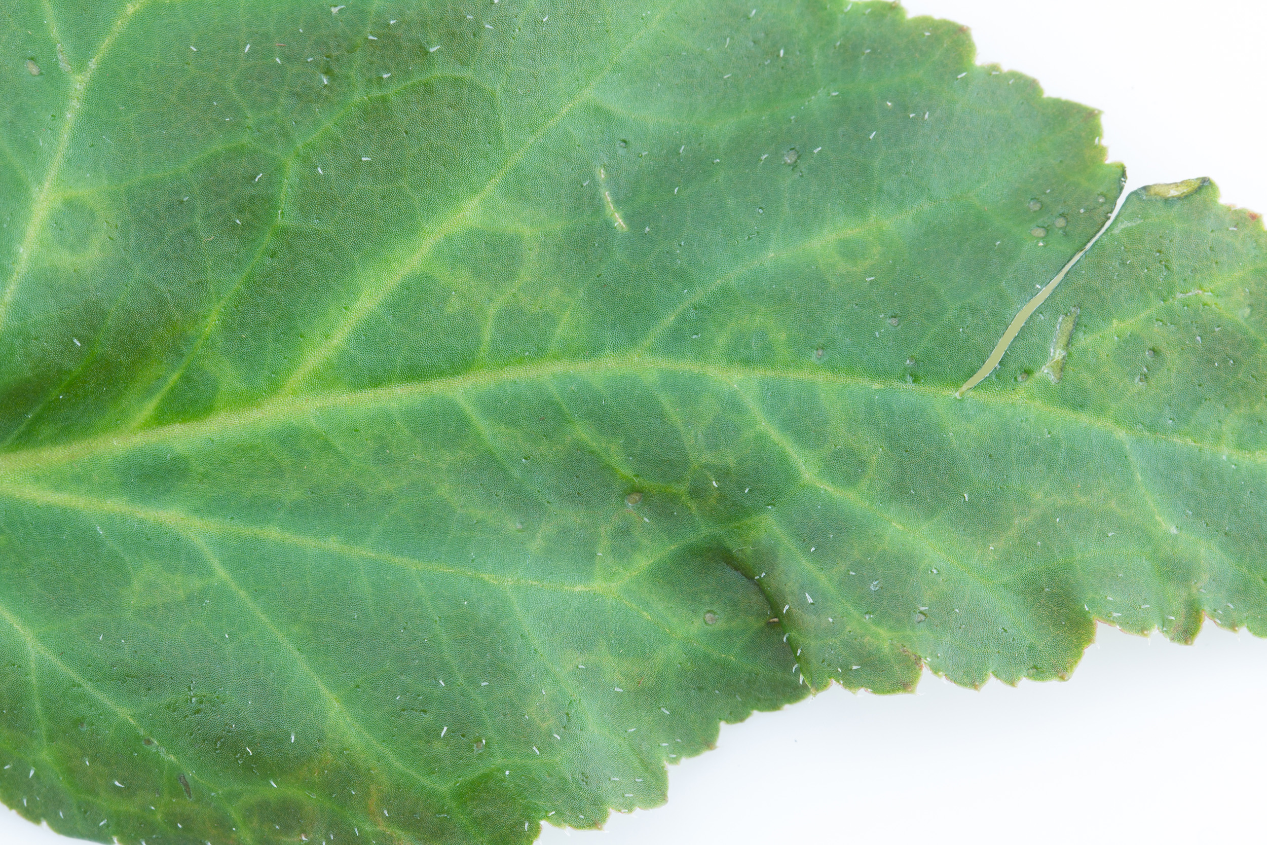 Une vue rapprochée d’une feuille d’un bégonia cultivé en serre montre de fins anneaux vert clair à jaunes localisés sur ou le long des nervures à la face supérieure. Le test de laboratoire (test ELISA) s’est révélé négatif pour la détection des virus (19 virus testés).