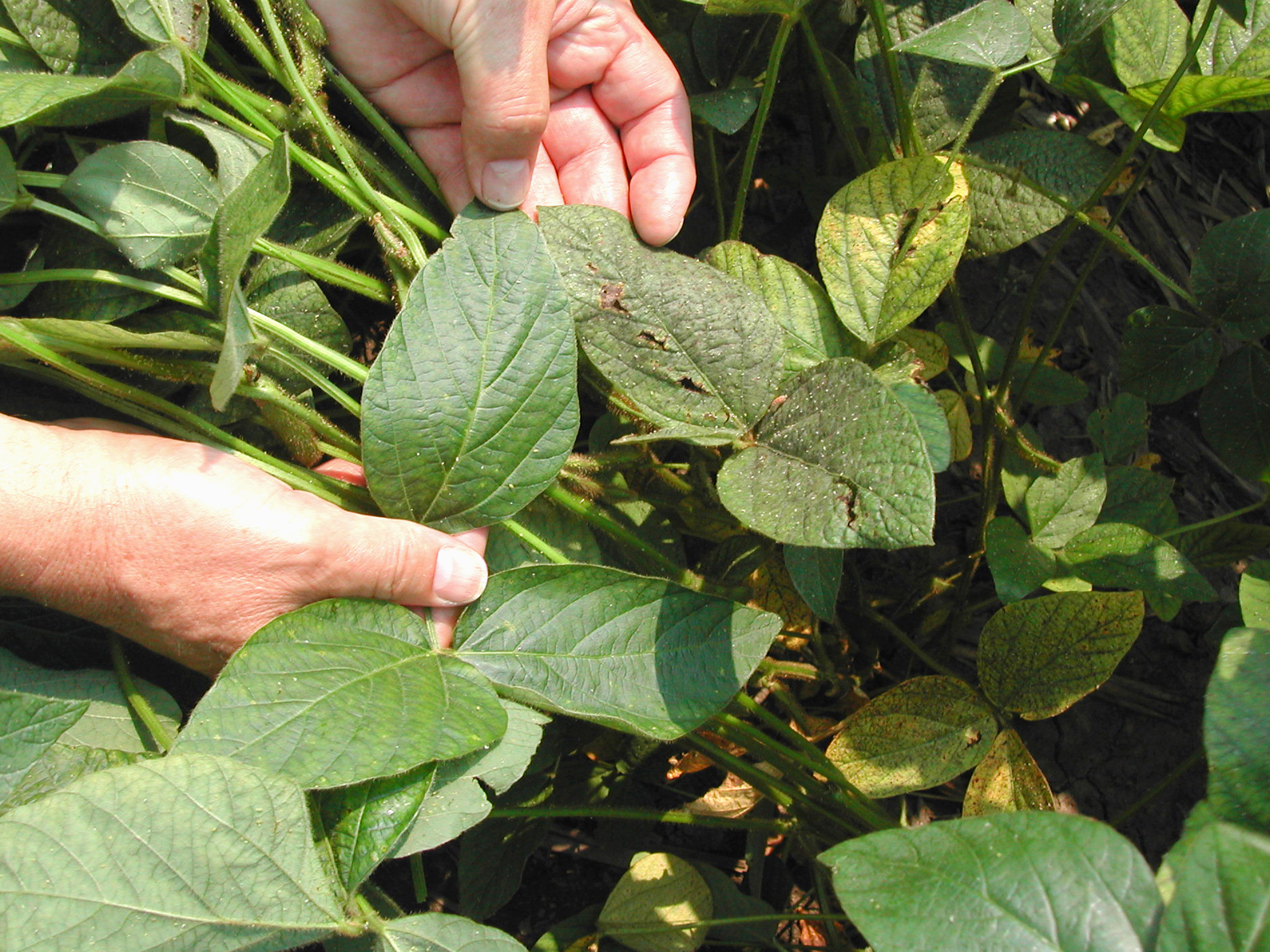 La feuille de soya de droite est noire et d'aspect terne lorsque comparée à une feuille sans symptôme. Les tests de laboratoire ont révélé la présence des champignons Cladosporium sp. et Alternaria sp.. Ces champignons forment un complexe fongique responsable de la fumagine chez différentes plantes, dont le soya.