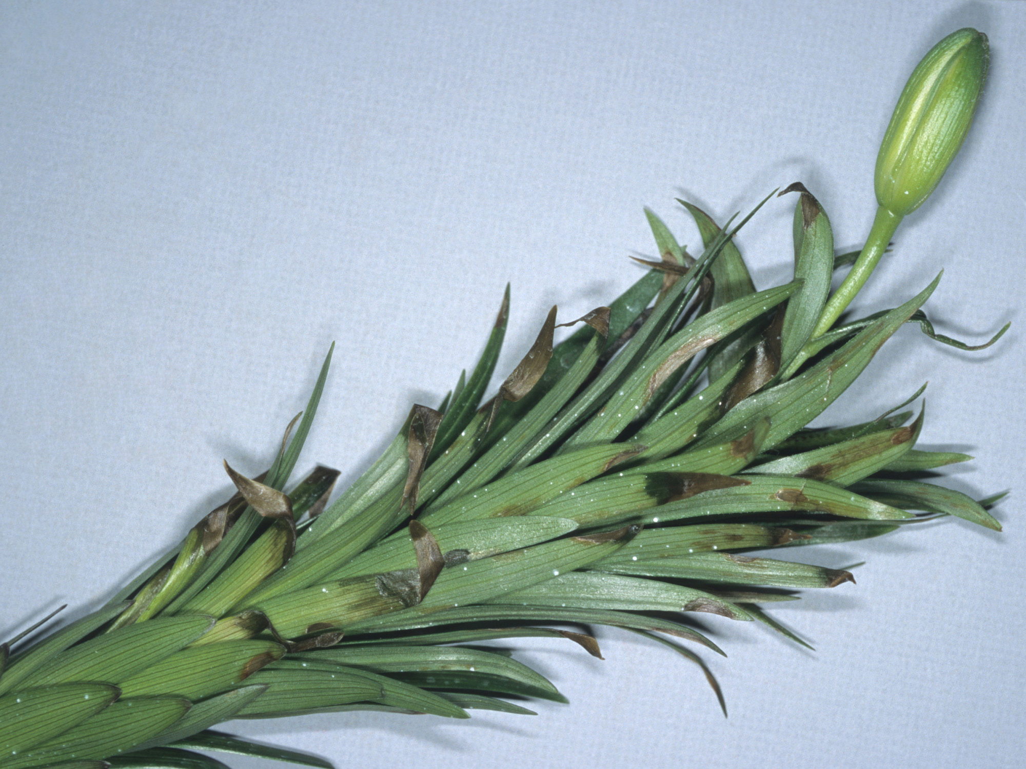 Les feuilles situées dans la moitié supérieure du plant présentent un dessèchement de l'apex et des taches sur le limbe. Les feuilles basales sont saines. Les racines en dessous du bulbe sont ramollies et celles au-dessus sont saines (non visible sur cette image). Les tests de laboratoire se sont avérés négatifs (champignons, bactéries).