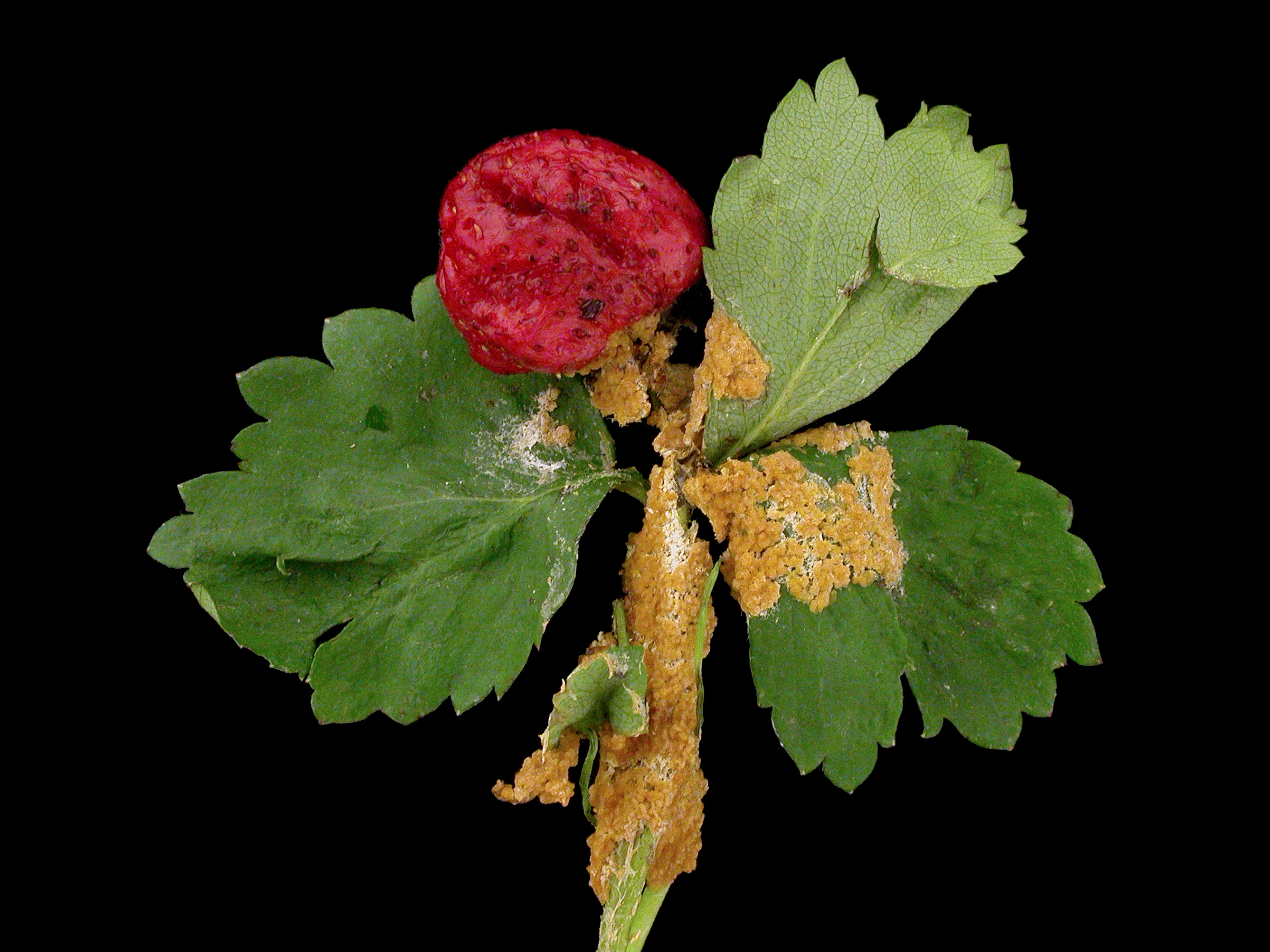 Différents organes d’un fraisier montrent la présence de masses gélatineuses (plasmodes) orange. Ces plasmodes sont caractéristiques de la phase végétative d’un myxomycète, responsable de la moisissure visqueuse chez le fraisier.