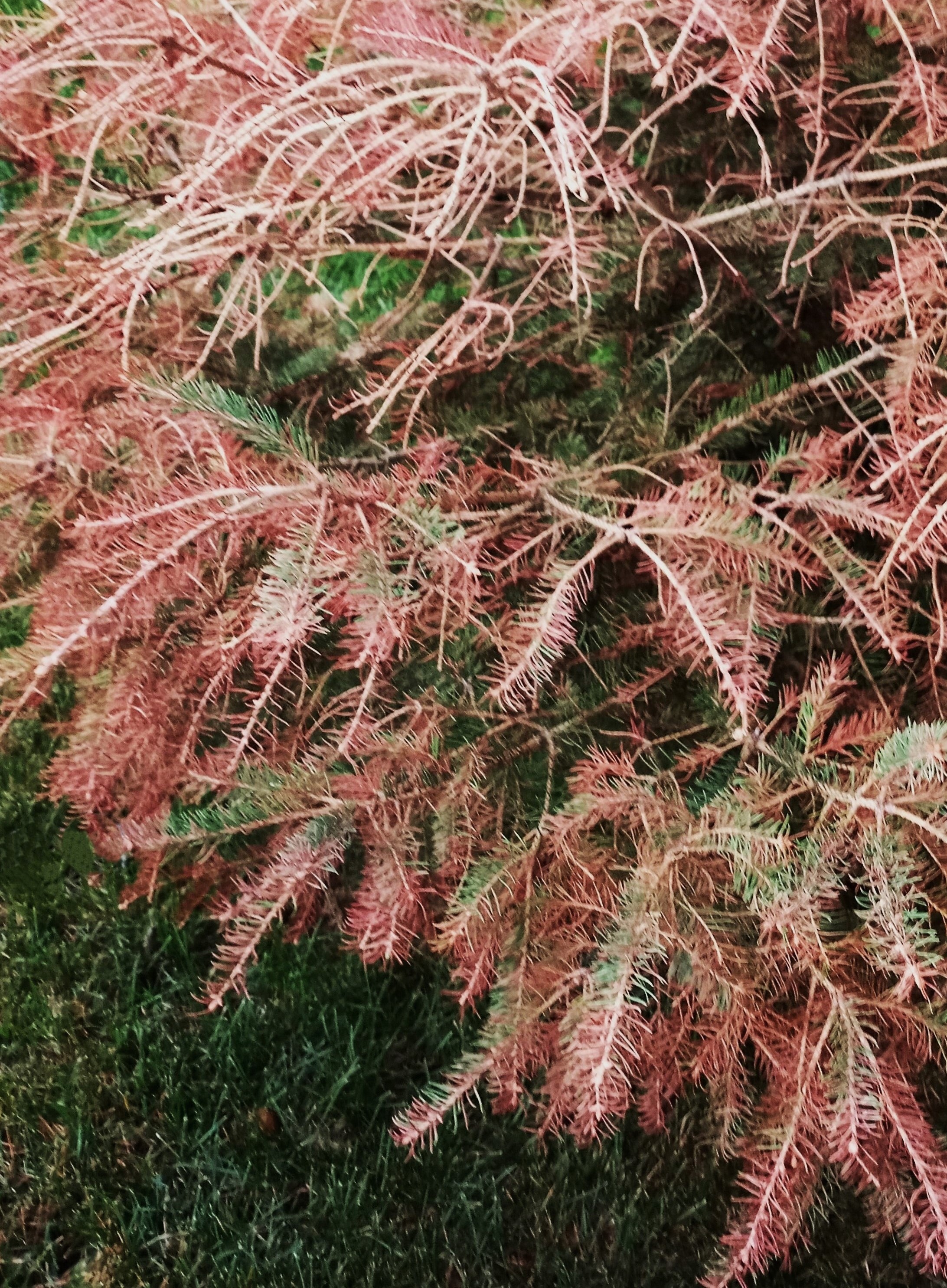 Tiges et aiguilles d’épinette de Norvège brulées et déformées