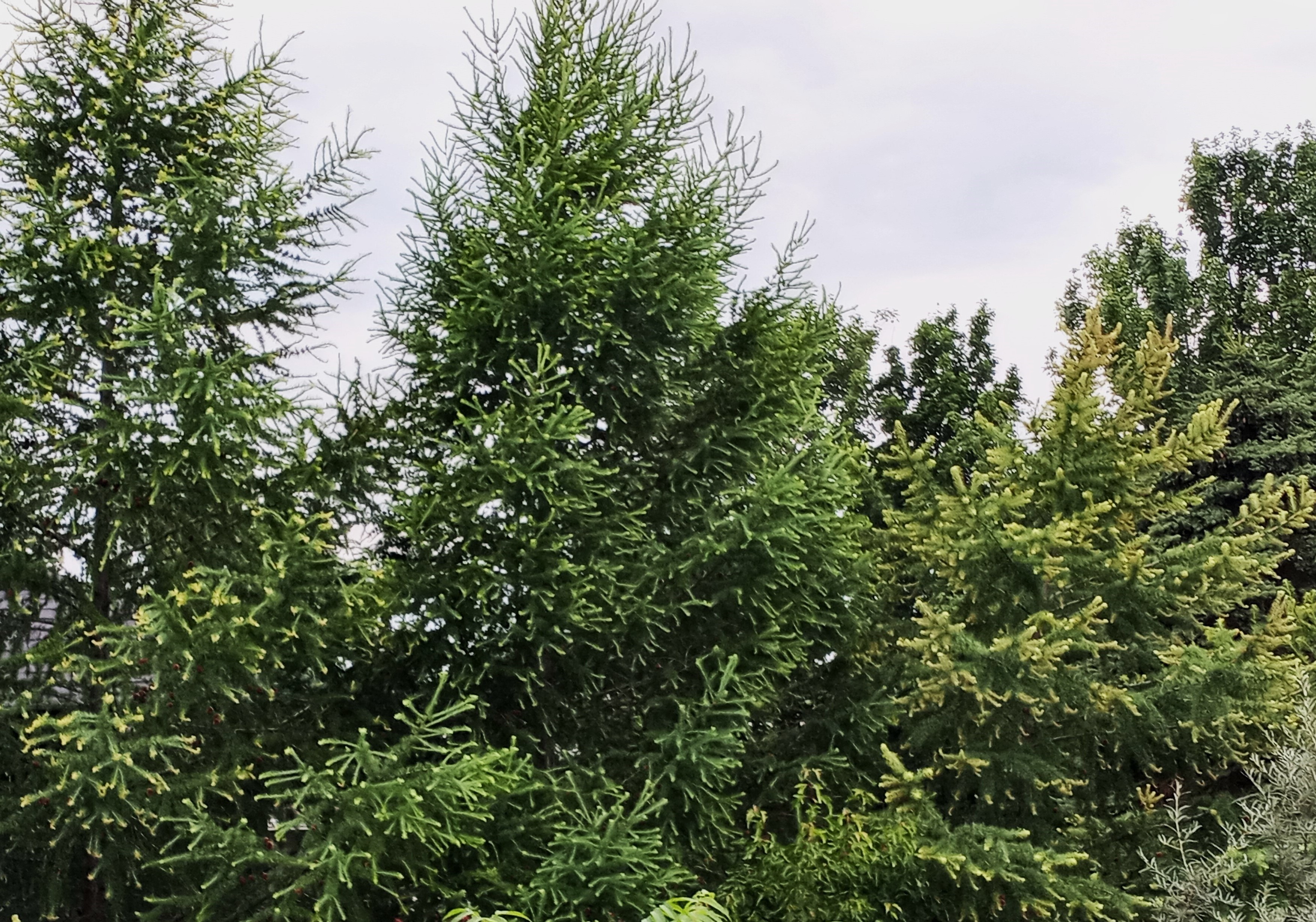 Les feuilles (aiguilles) de mélèzes laricins présentent de sévères jaunissements (brûlures beige-brunes) et les tiges terminales (rameaux) des malformations (épinastie, torsion). Ces symptômes sont apparus graduellement et sont généralisés sur tous les arbres à proximité d’une pelouse. Une application de dicamba, un herbicide phytohormonal, a été effectuée sur cette pelouse et au pied des arbres (par erreur), dans des conditions de chaleur et de sécheresse importantes. Une analyse chimique a confirmé la présence de dicamba, à une concentration élevée, cinq semaines après son application. Après ce délai, les feuilles (aiguilles) s’effritent et la majorité tombent (non visible ici). Les symptômes de malformation sont typiques de ceux retrouvés avec les herbicides phytohormonaux, tel le dicamba. Les conditions de déficit hydrique (sécheresse, chaleur, érosion éolienne, etc.) au moment de l'application ont accéléré la pénétration et le transport du produit à l’intérieur des arbres, ce qui a amené une malformation des tissus et éventuellement la lyse des cellules méristématiques (dessèchements, jaunissements, brûlures et défoliation).