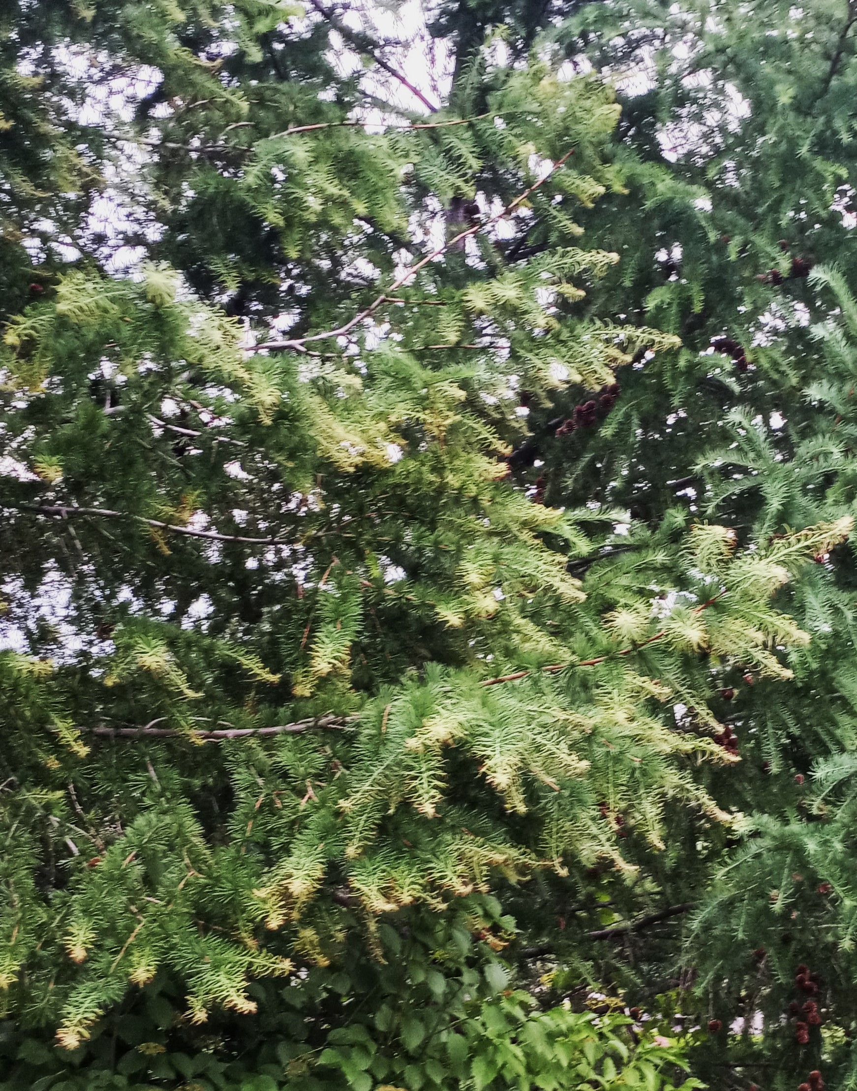 Les feuilles (aiguilles) de mélèzes laricins présentent de sévères jaunissements (brûlures beige-brunes) et les tiges terminales (rameaux) des malformations (épinastie, torsion). Ces symptômes sont apparus graduellement et sont généralisés sur tous les arbres à proximité d’une pelouse. Une application de dicamba, un herbicide phytohormonal, a été effectuée sur cette pelouse et au pied des arbres (par erreur), dans des conditions de chaleur et de sécheresse importantes. Une analyse chimique a confirmé la présence de dicamba, à une concentration élevée, cinq semaines après son application. Après ce délai, les feuilles (aiguilles) s’effritent et la majorité tombent (non visible ici). Les symptômes de malformation sont typiques de ceux retrouvés avec les herbicides phytohormonaux, tel le dicamba. Les conditions de déficit hydrique (sécheresse, chaleur, érosion éolienne, etc.) au moment de l'application ont accéléré la pénétration et le transport du produit à l’intérieur des arbres, ce qui a amené une malformation des tissus et éventuellement la lyse des cellules méristématiques (dessèchements, jaunissements, brûlures et défoliation).