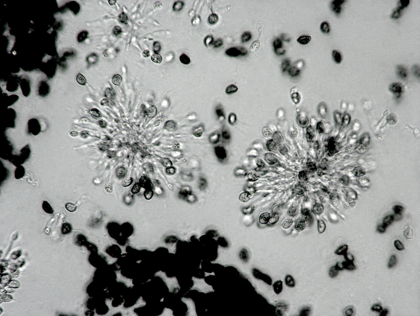Conidies et conidiophores provenant de pycnides de Coniella fragariae