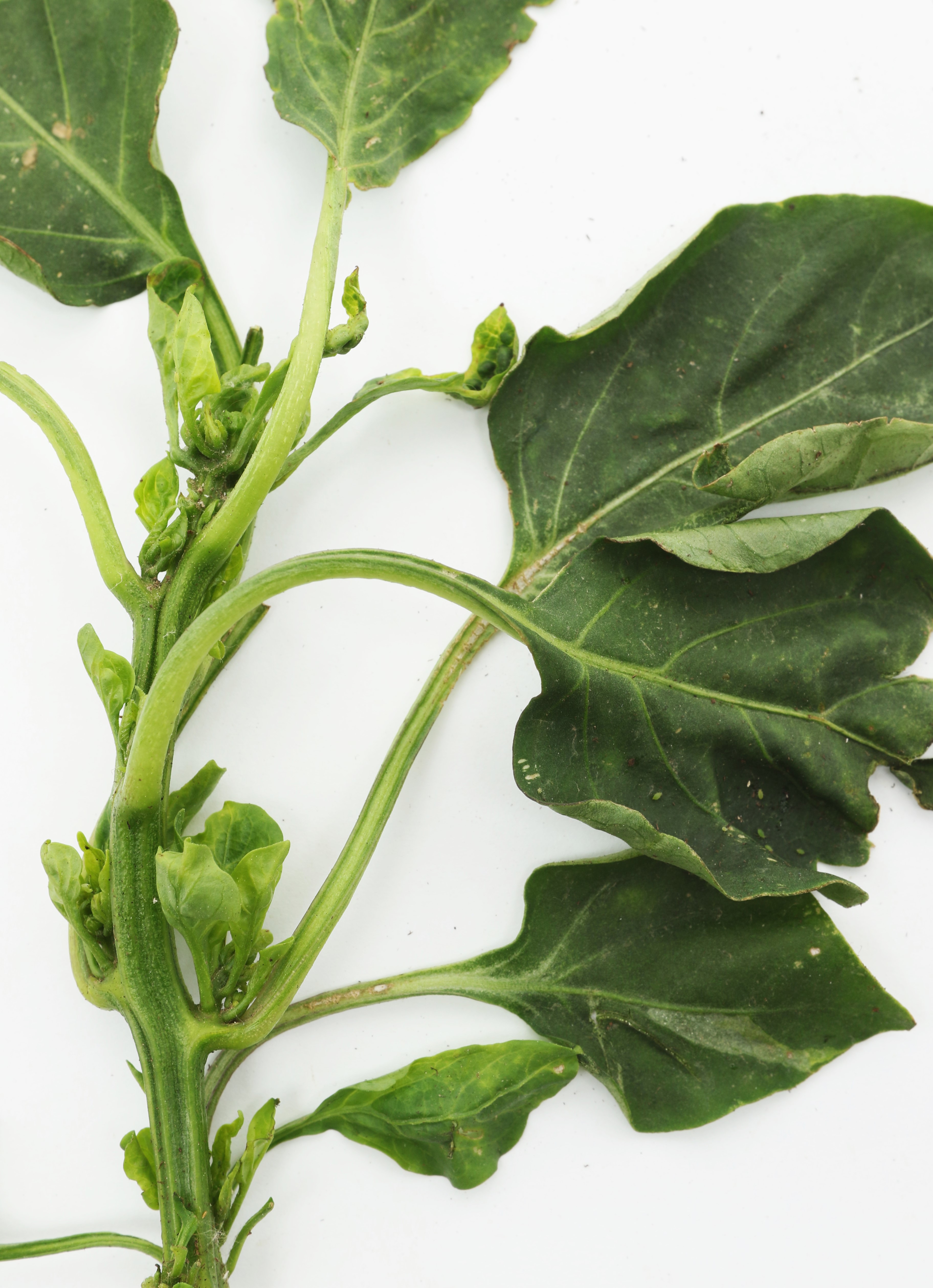 Les feuilles terminales d’un plant de poivron (piment doux) sont déformées, le limbe est gaufré et texturé. Un jaunissement, léger et diffus, internervaire, débute à la base du limbe et progresse vers l’apex. Par ailleurs, aucun des virus testés n'a été détecté dans les feuilles de cet échantillon. Le dosage chimique réalisé a révélé une concentration assez élevée de S-métolachlore dans les tissus du poivron. L’herbicide DUAL II MAGNUM (S-métolachlore) a été appliqué sur la culture : même s’il y est homologué, il peut provoquer des dommages qui débutent par un jaunissement internervaire, suivi d’un brunissement et une nécrose des tissus. Il peut également causer des malformations sur les parties terminales. Dans ce cas-ci, le printemps frais et humide peut avoir contribué à ralentir la métabolisation de l’herbicide dans la plante, accentuant ainsi les symptômes de phytotoxicité. Le flonicamide et le terbacil ont aussi été détectés à une concentration normale mais ne sont pas associés aux symptômes observés.