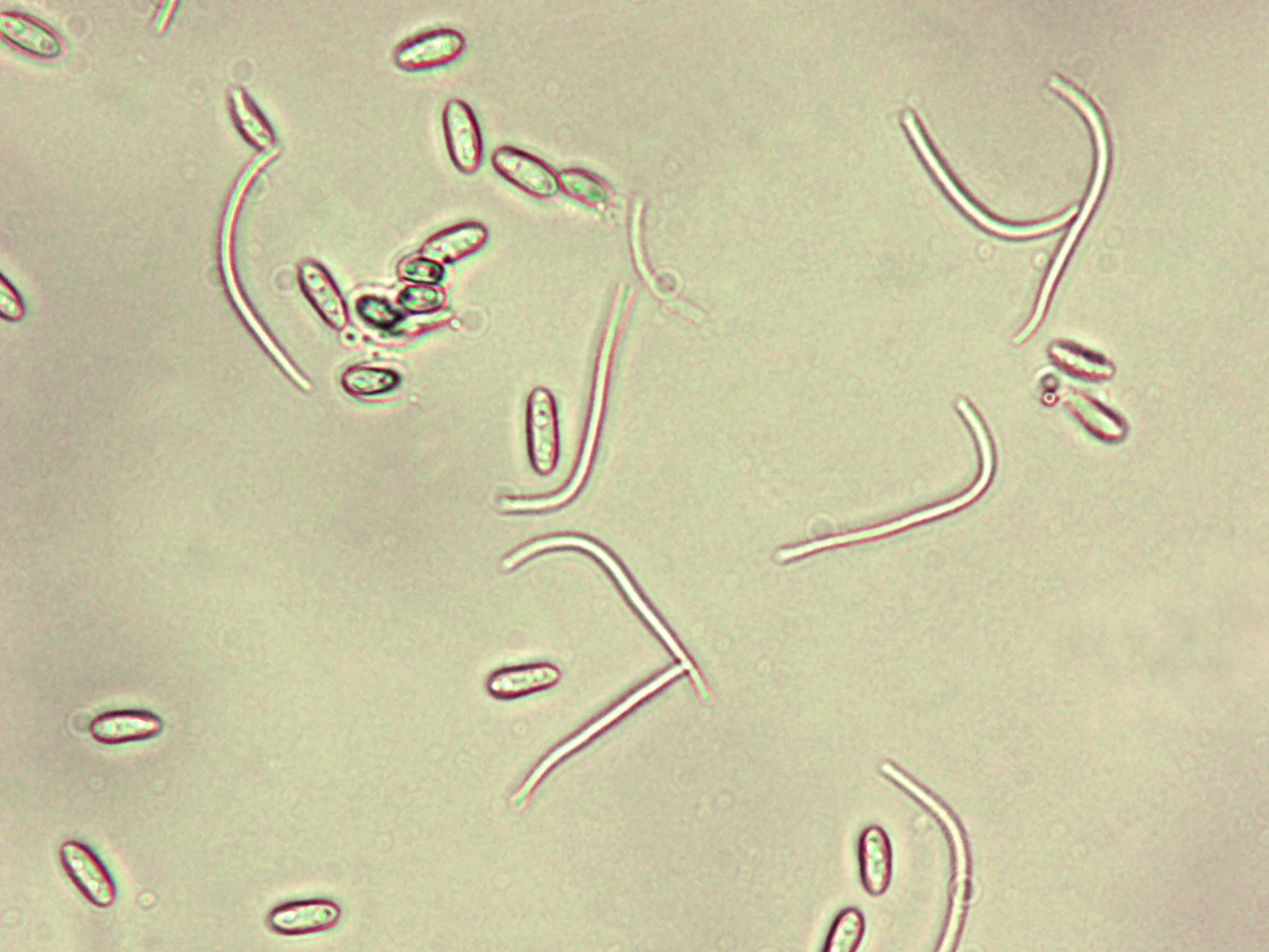 Conidies alpha (α) cylindriques et conidies bêta (β) filiformes et recourbées ayant la forme d’un bâton de Hockey de Phomopsis sp. (x 400)