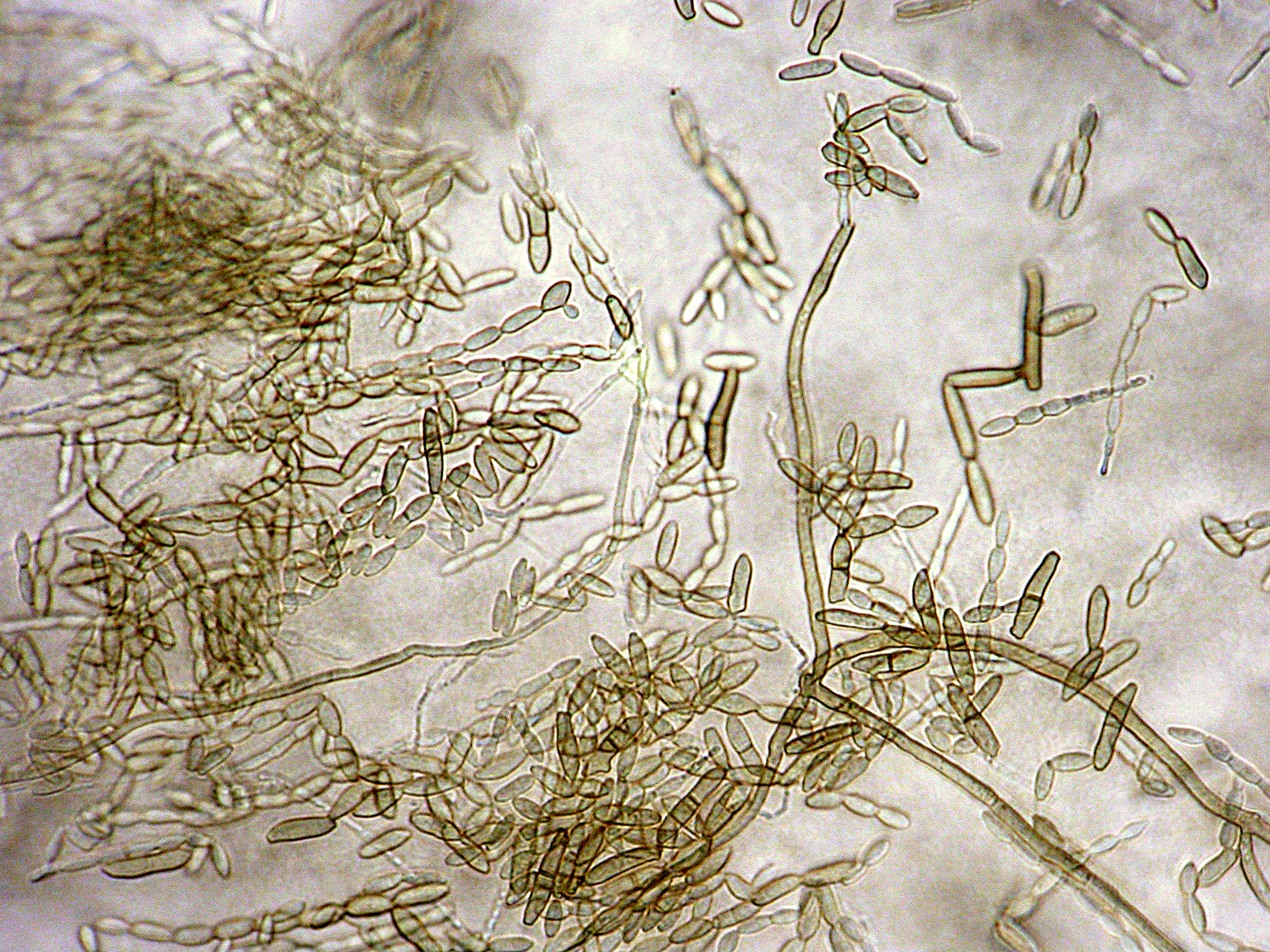 Conidies (amérospores cylindriques) en chaîne de Ramularia sp.