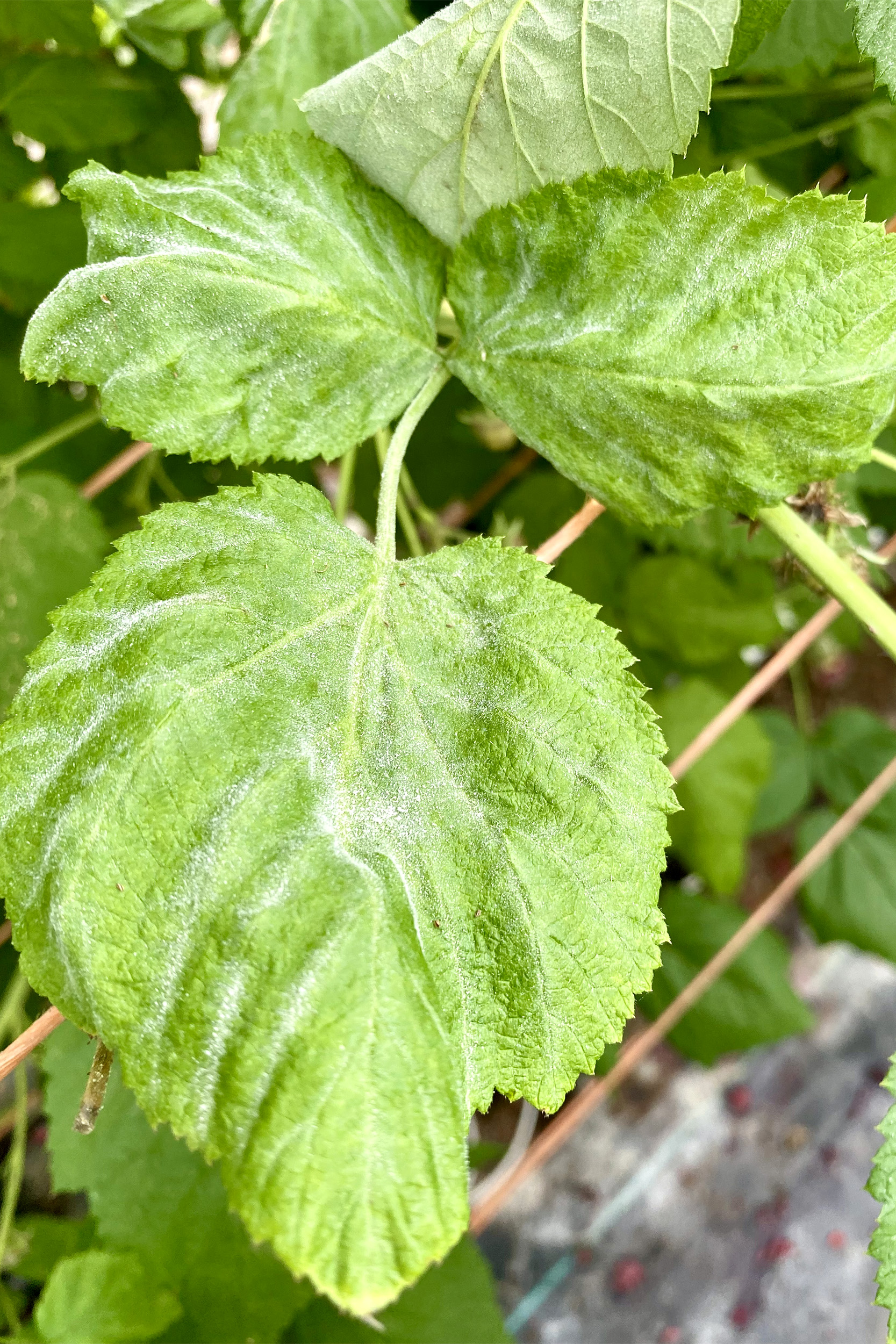 Duvet blanc poudreux causé Podosphaera sp. sur la face supérieure d'une feuille de framboisier.