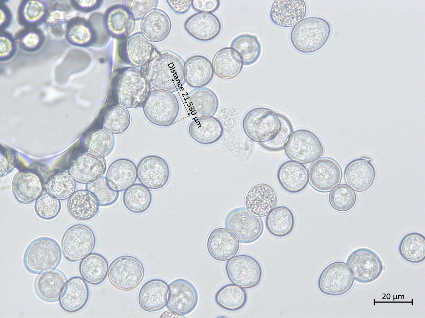 Sporanges de Albugo candida, sphériques à ovales, subhyalin, vacuolés, de 15 à 20 μm de diamètre. Observés sur une feuille de navet infectée par la rouille blanche.