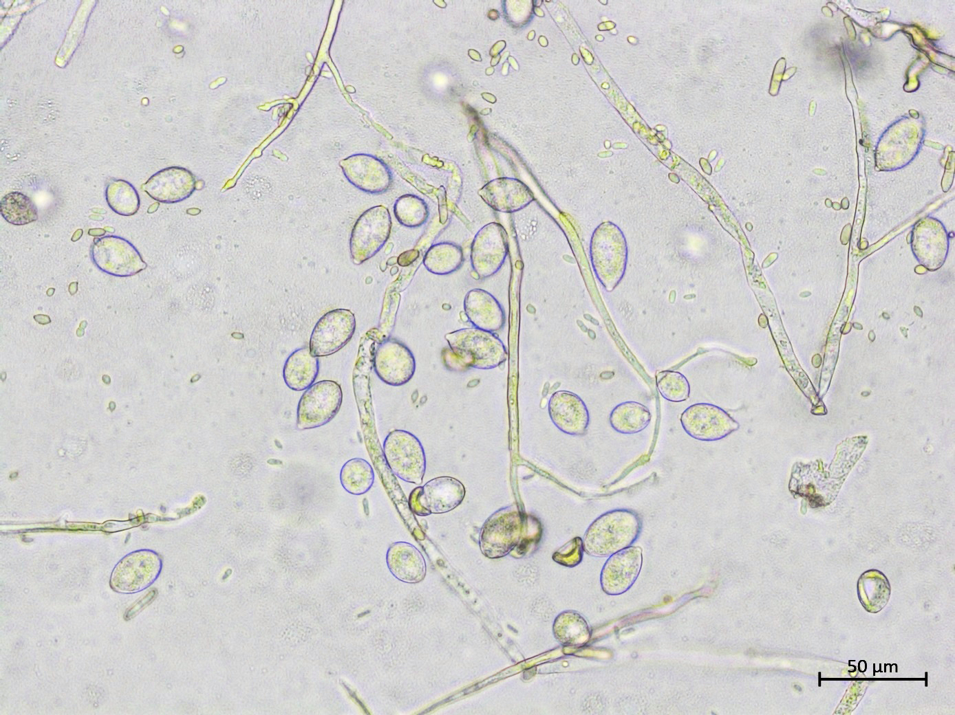 Les petites conidies oblongues en arrière plan n'appartiennent pas à Phytophthora infestans. Elles correspondent aux conidies de Cladosporium sp.