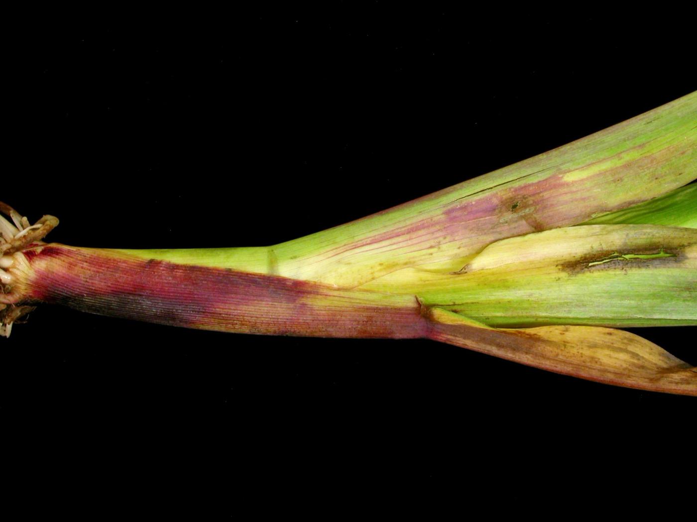 Légende: Blanchiment de la nervure centrale sur feuille de maïs grain et fourrager