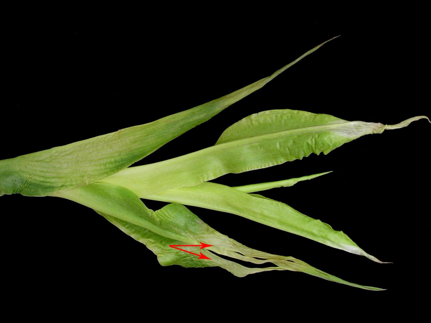 Description: Sur les feuilles d’un plant de maïs grain et fourrager non tolérant (variété non tolérante) au glyphosate, la pointe des jeunes feuilles est blanche et ce blanchiment se manifeste également sur les feuilles plus âgées (voir flèches). Ce symptôme est apparu à la suite d’une dérive de l’herbicide glyphosate appliqué dans un champ de maïs voisin.