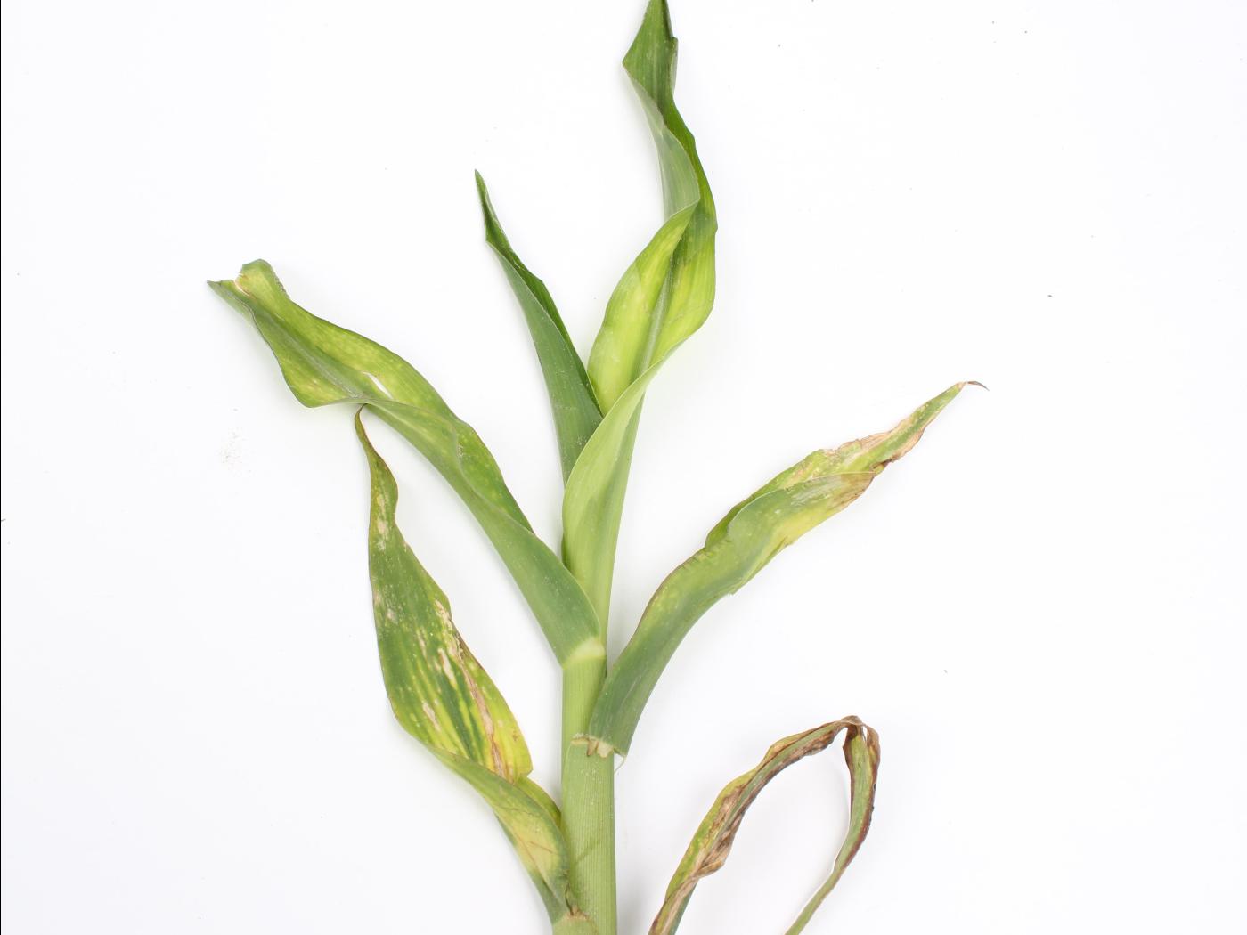 Légende: Feuilles de maïs avec blanchiment internervaire et brûlures