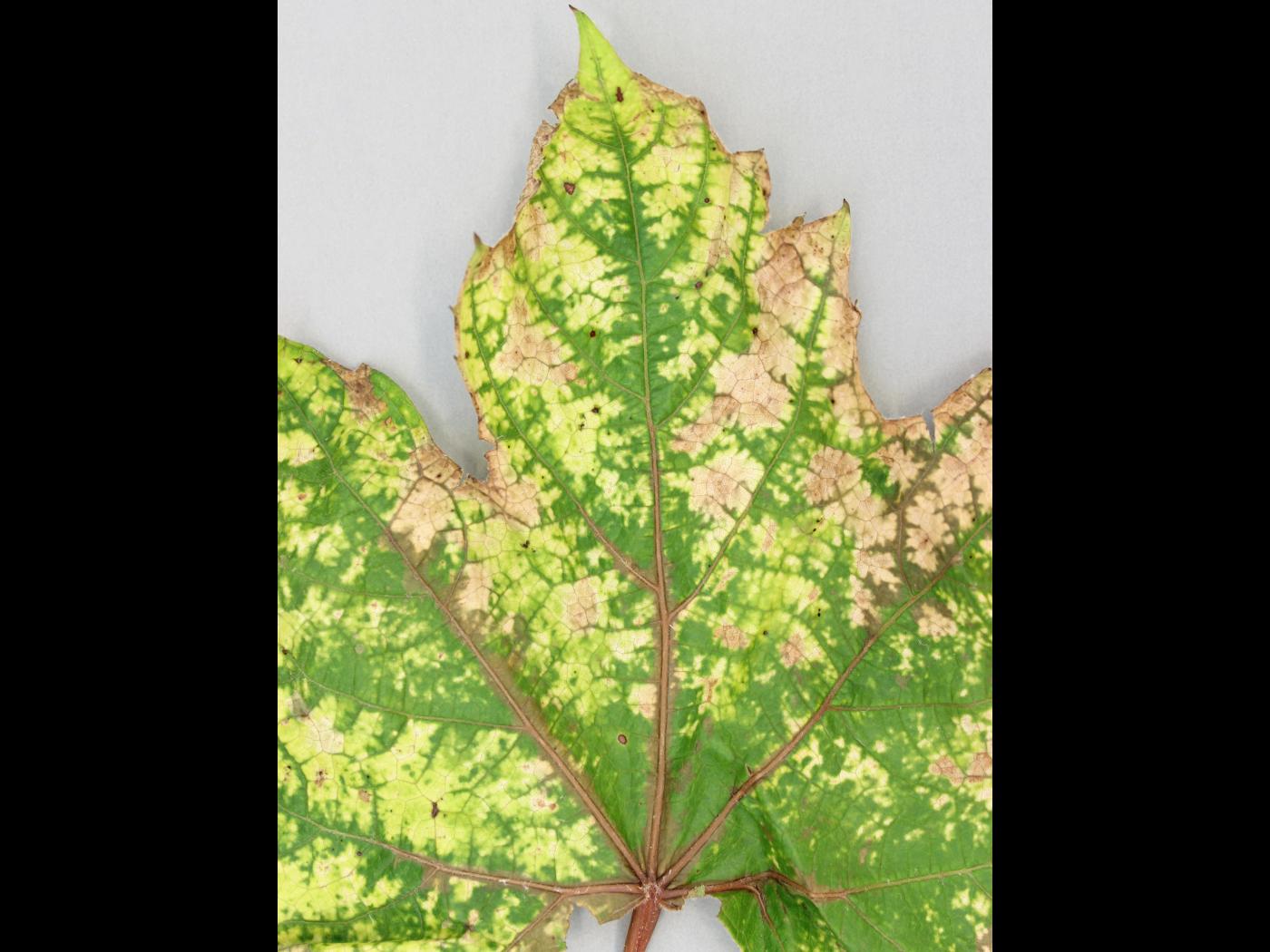 Feuille : les jeunes feuilles et les points de croissance présentent des anomalies de coloration jaunissement internervaire) et des malformations (feuilles recourbées vers le haut, feuilles au limbe réduit, effilée ou petite la deuxième année; enroulement). Les nervures demeurent vertes.