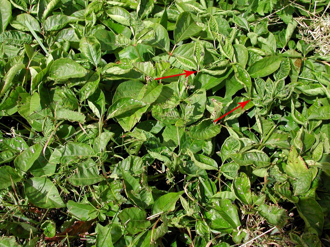 Cas dicamba – Le dicamba est un herbicide, considéré comme un régulateur de croissance, utilisé pour lutter contre les mauvaises herbes à feuilles larges, annuelles, bisannuelles et vivaces. Le dicamba est homologué dans la culture du maïs, des céréales, des prairies, du bleuet nain mais pas dans le soya. Il peut être pulvérisé en prélevée ou en postlevée de la culture. Les herbicides régulateurs de croissance peuvent causer toute une variété d’anomalies de croissance chez les espèces sensibles, selon l’intensité d’exposition. Les symptômes de phytotoxicité se rapportant au dicamba sont des déformations (épinastie) de la tige et des pétioles, un renflement de la tige aux entre-noeuds et une élongation anormale de ceux-ci, et des feuilles en forme de cuillère. S'ensuit le jaunissement des points de croissance, le flétrissement et la nécrose des tissus. Parce que le dicamba est systémique, les symptômes qui lui sont attribuables apparaissent à la suite de la translocation du produit dans la plante, autant par le phloème que le par le xylème et particulièrement chez les plus jeunes feuilles, laquelle peut nécessiter d’un à trois jours. Les symptômes au champ présentent un gradient allant du plus au moins affecté, à mesure que l’on s'éloigne de la zone traitée. Le soya est extrêmement sensible au dicamba.