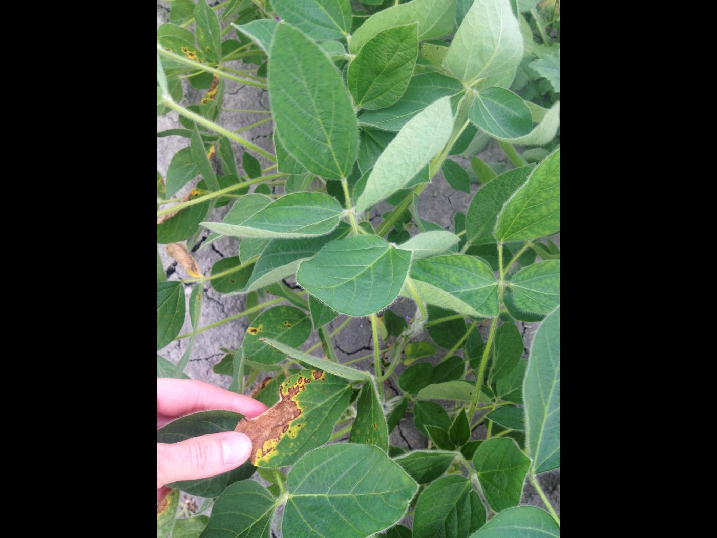 Légende: Feuilles basales et médianes de soya avec jaunissement et brûlures du limbe