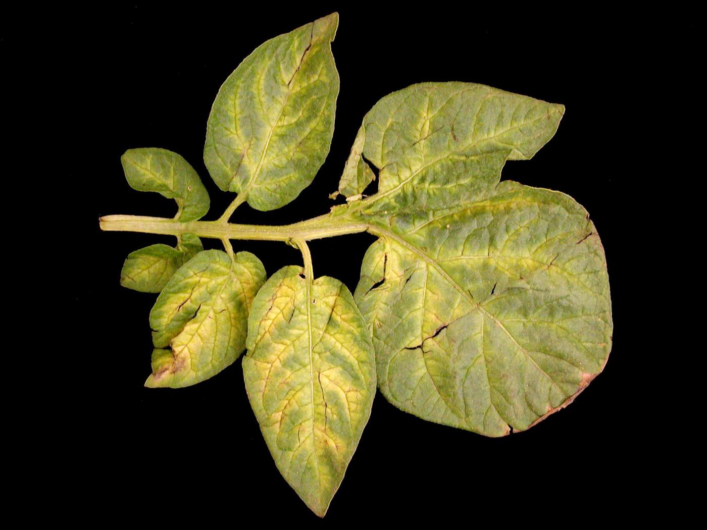 Feuille : au début, jaunissement de la marge et à l’apex des vieilles feuilles puis jaunissement des nervures principales et secondaires et/ou entre les nervures, nécrose (brunissement et dessiccation). Mortalité potentielle.
