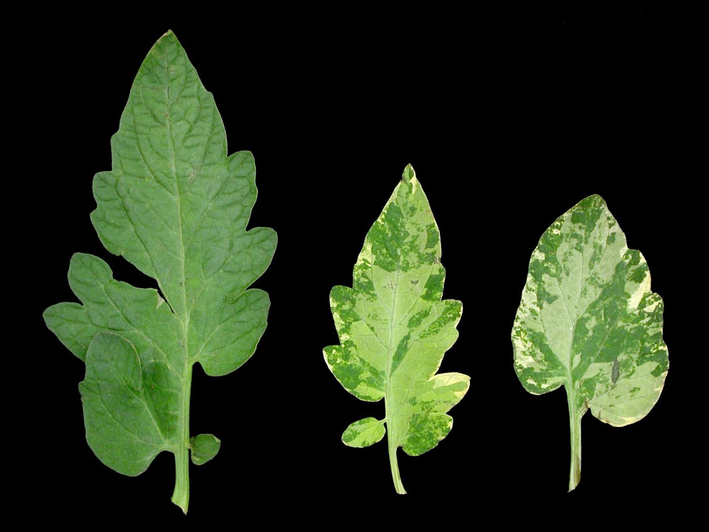 Description: Comparaison entre une foliole de tomate de serre (cv ‘Westland’) saine et deux folioles affectées. Les folioles affectées montrent de grandes plages vert grisâtre, jaunes ou blanches, dont la marge est bien délimitée des tissus sains. Aucun virus n’a été détecté des dommages. Ce symptôme est caractéristique d’un désordre génétique appelé argenture.