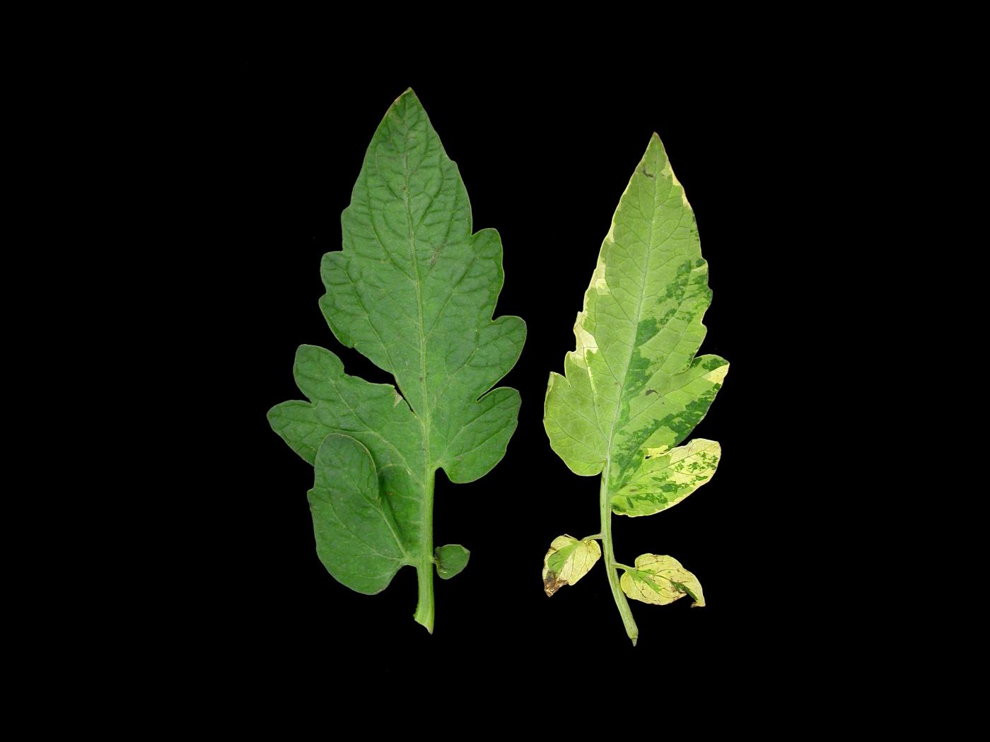 Description: Comparaison entre une foliole de tomate de serre (cv 'Westland') saine et affectée. La foliole affectée montre des plages jaunâtres, dont la marge est bien délimitée des tissus sains. Les symptômes sont observés principalement sur un seul côté du limbe. Aucun virus n’a été détecté des dommages. Ce symptôme est caractéristique d’un désordre génétique appelé argenture.