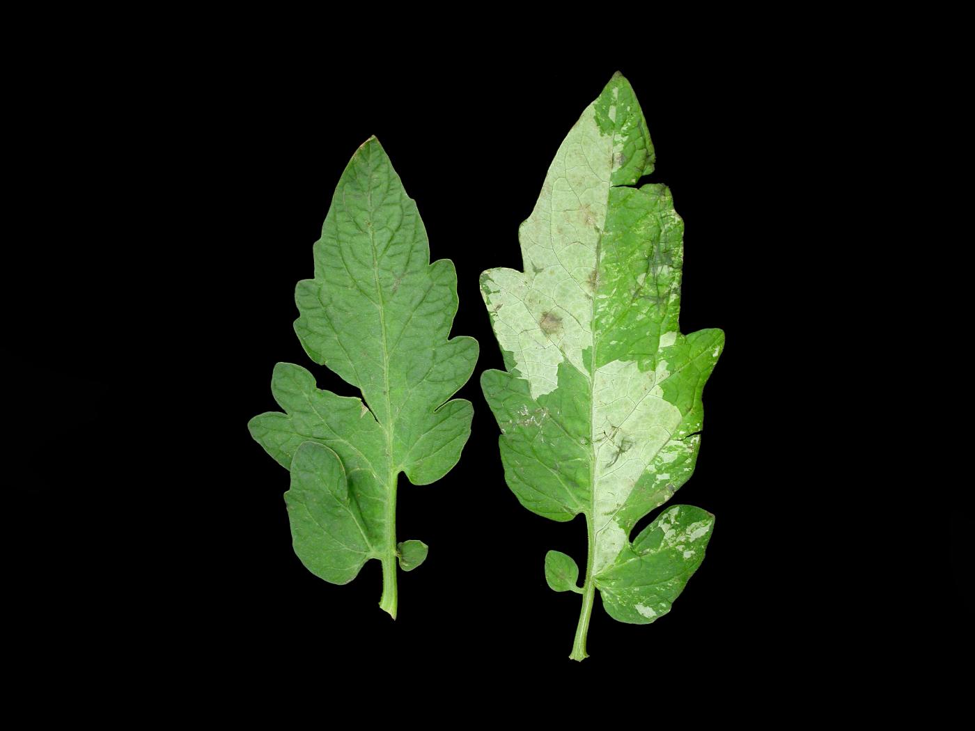 Légende: Comparaison entre une foliole de tomate saine et affectée