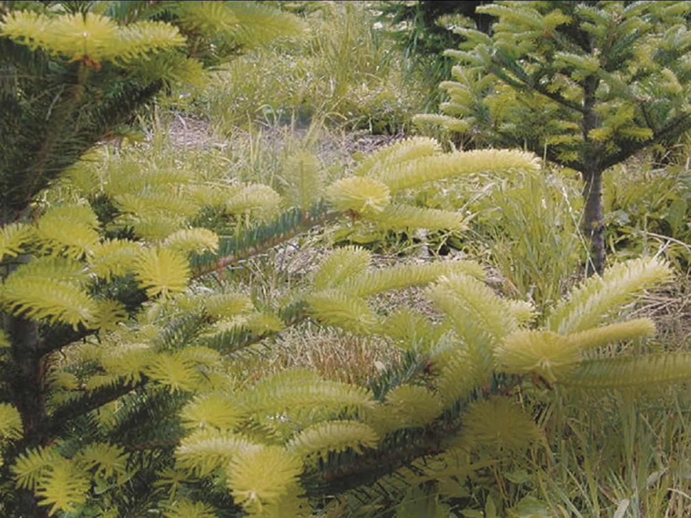 Les aiguilles sont jaunies et plus courtes que sur les arbres sains. Plus faible rétention des aiguilles.