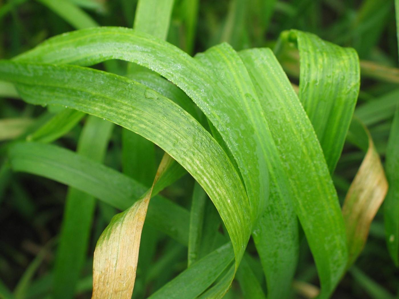 Description: À la face supérieure des feuilles de blé d’automne, présence de bandes longitudinales jaunâtres entre les nervures vertes. À un stade plus avancé, les feuilles se dessèchent. Ces symptômes sont caractéristiques d’une carence en manganèse chez le blé.