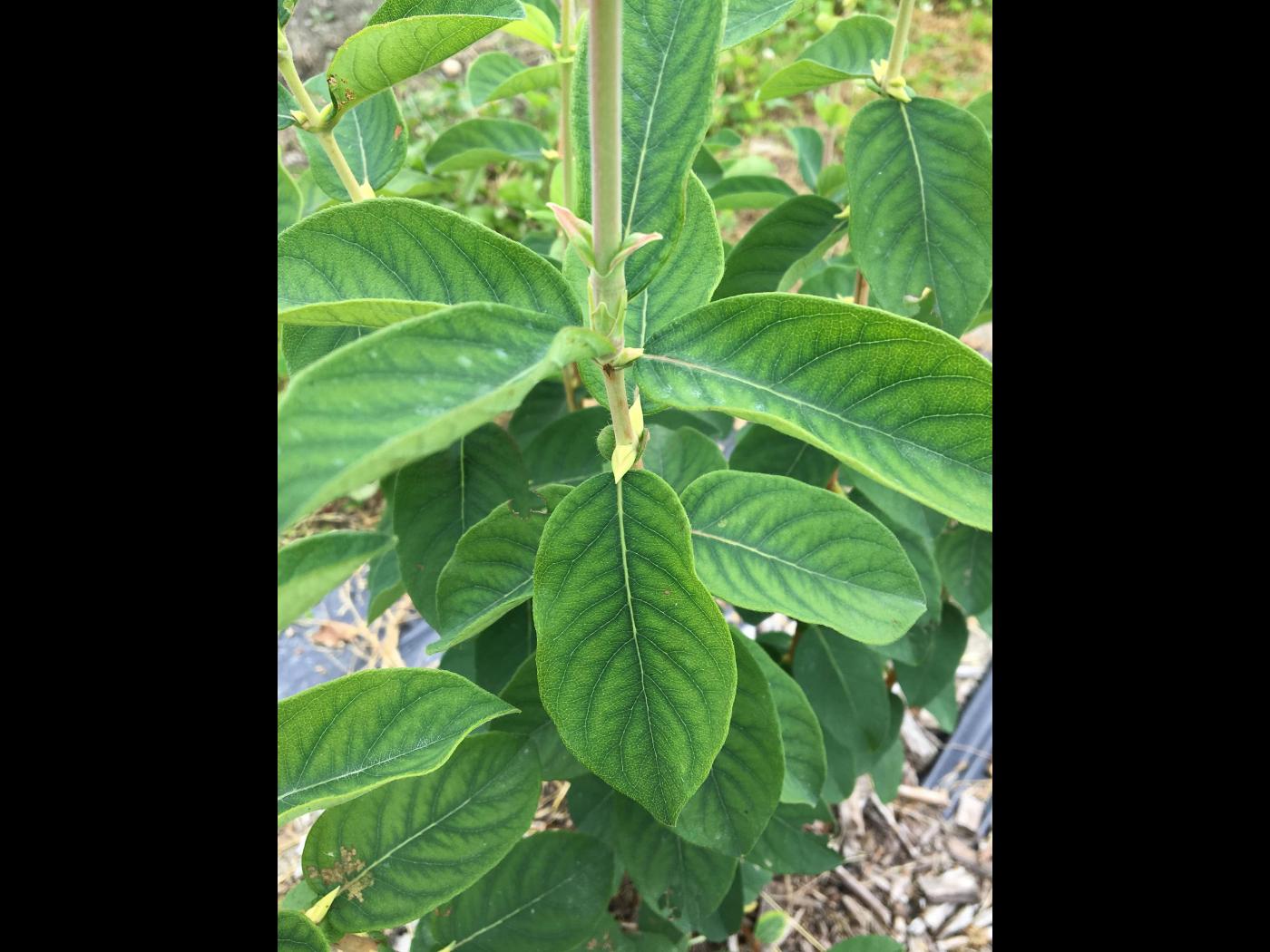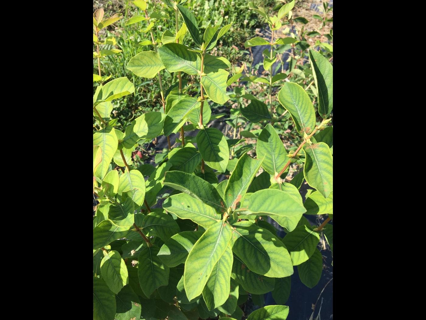 Description: Vu d’ensemble d’un plant de camerise présentant un un jaunissement internervaire, à la suite à une carence en manganèse.