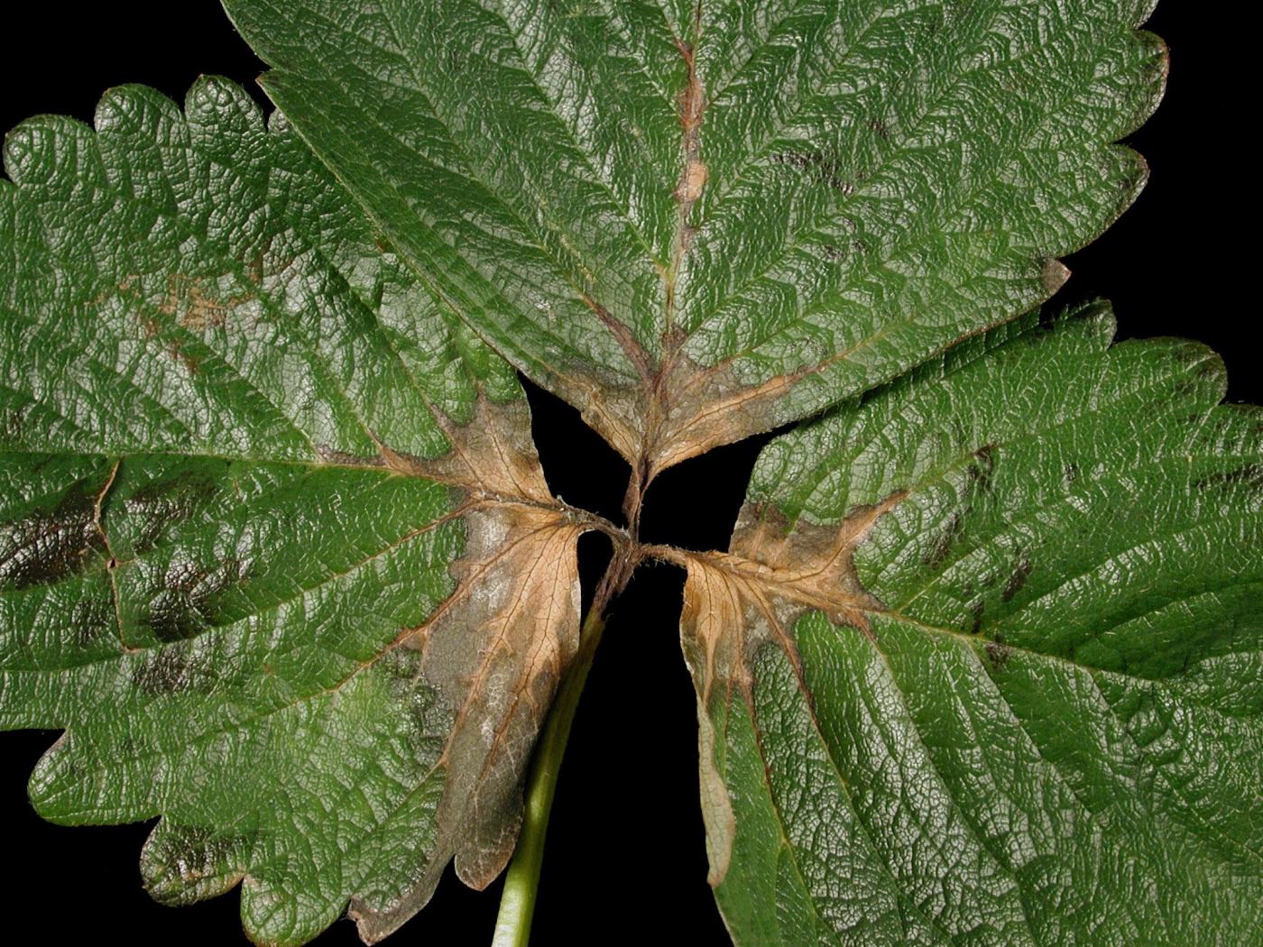 Feuille et pétiole : se manifeste sur les feuilles matures sous deux formes soit (1) par le brunissement débutant à la base des folioles et progressant sur les nervures et les pétioles. Les tissus affectés sèchent. (2) par le rougissement uniforme de la marge des feuilles, anomalie de coloration visible sur les deux faces. Le rougissement progresse entre les nervures mais n’atteint jamais la nervure centrale. C’est le symptôme généralement observé sur les feuilles de fraisier. Nécrose à la marge des feuilles âgées. Le pétiole peut devenir nécrotique ce qui cause le noircissement des folioles.
