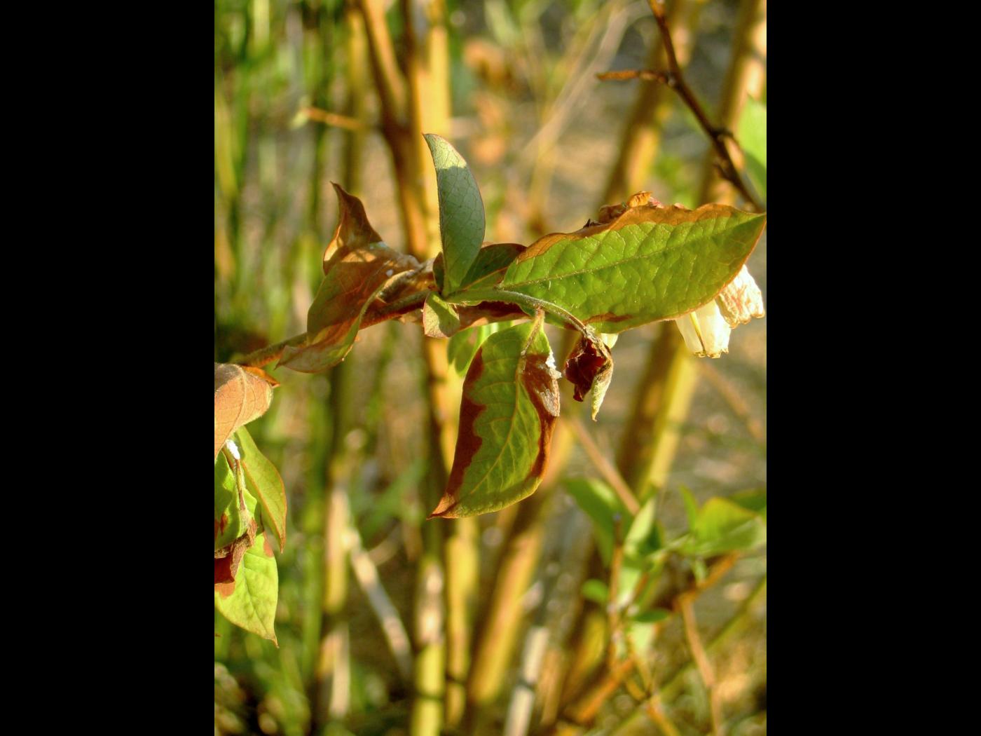 Feuille : brûlure partielle ou complète de la marge, à l’apex ou sur le limbe. Souvent présence d’une pellicule blanchâtre (dépôt) sur le limbe.