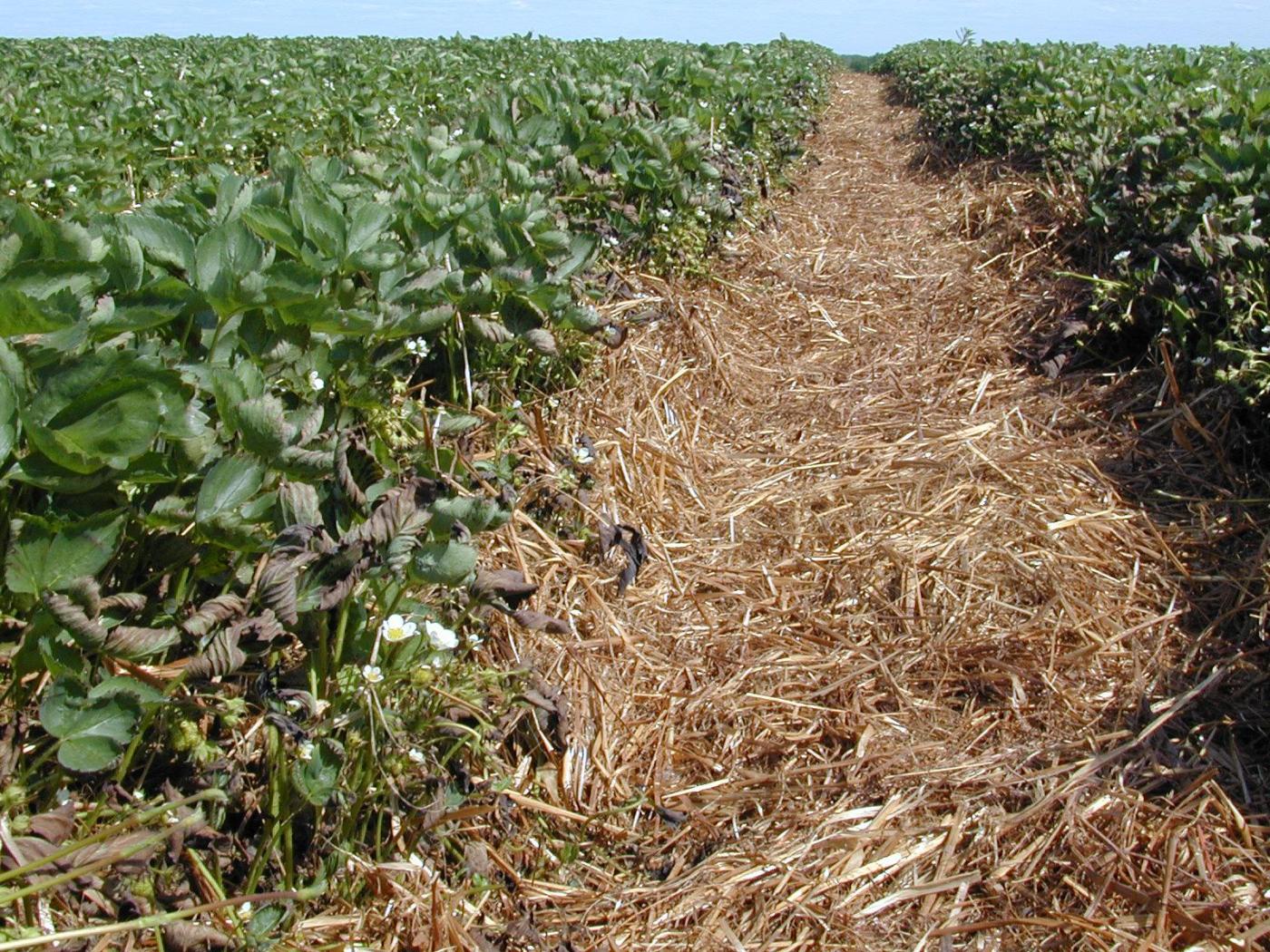 La paille est traitée à l’ammoniac anhydre pour détruire les graines de mauvaises herbes et parfois pour améliorer la valeur azotée du fourrage destiné à la consommation animale. Comme le NH3 est un gaz très volatile à température et pression ambiantes, il est injecté dans de grosses balles de paille enveloppées d’une bâche de plastique épais et hermétique. La paille passe ainsi l’hiver. Au printemps, la paille est déballée et épandue dans les entre-rangs des fraisières. Lorsque des vapeurs d’ammoniac sont encore perceptibles, le contact de la paille avec le feuillage peut occasionner des malformations et des brûlures. Heureusement, le traitement de la paille à l’ammoniac a perdu ses lettres de noblesse au cours de la dernière décennie au profit d’un traitement herbicide au glyphosate (Round up) ou à la vapeur. Ce problème non parasitaire est aujourd’hui occasionnel et mineur.