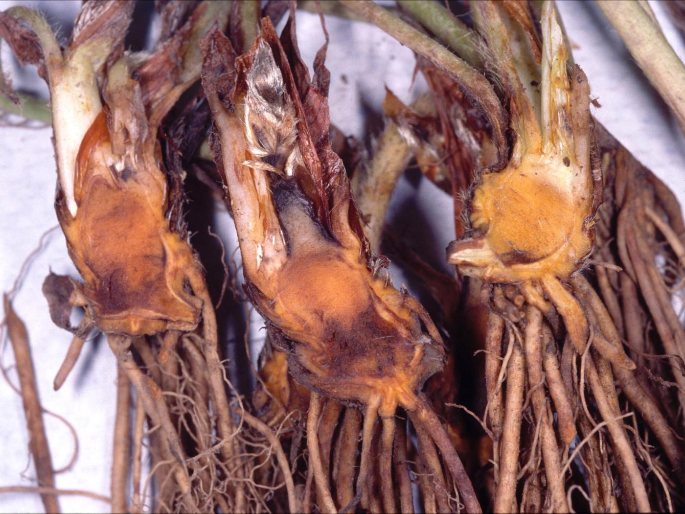Le gel en entrepôt peut être confondu avec des dommages de stèle rouge (Phytophthora fragariae – aucun brunissement du collet, mais plutôt une stèle rouge des racines), le pourridié phytophthoréen (Phytophthora cactorum – racines abondantes, généralement brunissement dans la partie supérieure du collet), la pourriture noire des racines (complexe fongique – racines noires, collet sans symptôme) et le flétrissement verticillien (Verticillium spp. – flétrissement et dépérissement des vieilles feuilles, collet généralement sain, mais parfois brunissement du système vasculaire).