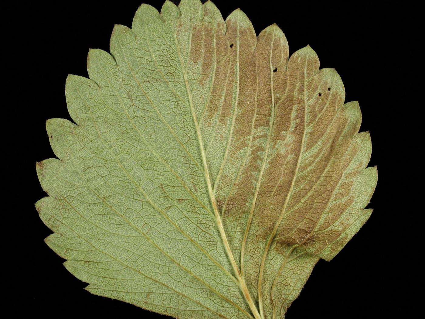 Lors de journées chaudes, très ensoleillées et venteuses, la face inférieure des feuilles de fraisier devient directement exposée aux rayons du soleil. Comme la face inférieure est plus sensible au soleil que la face supérieure, les tissus brûlent plus facilement. Ce symptôme apparait souvent près de l’apex et une délimitation nette permet de voir la partie exposée au soleil de celle qui ne l’était pas. Les dommages sont fréquents mais mineurs.