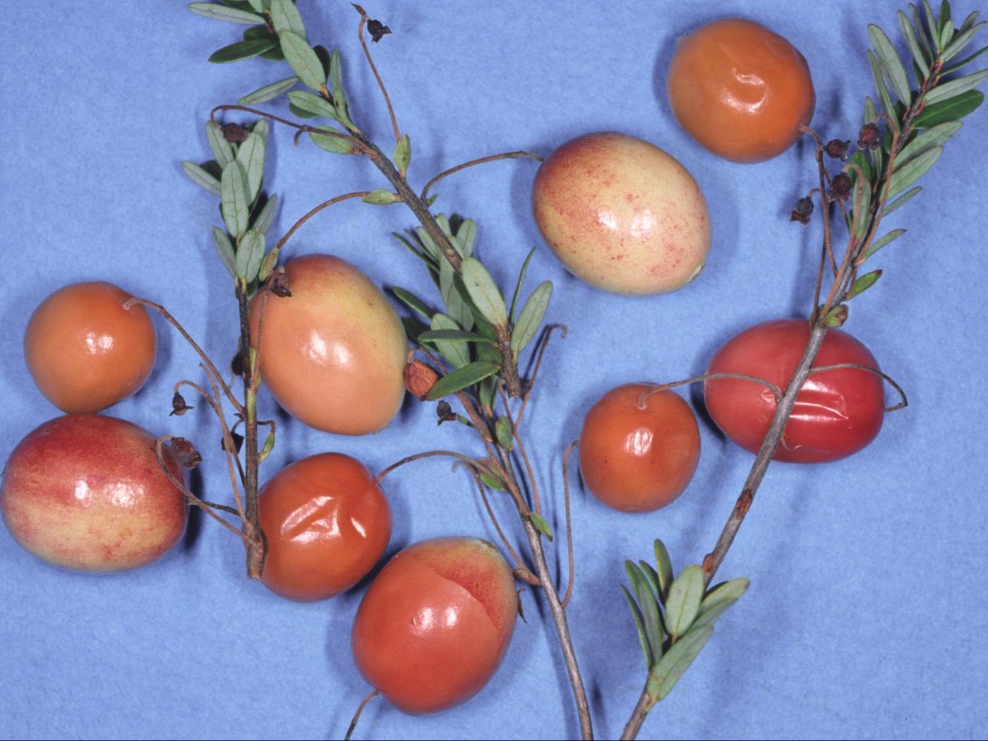 Chez la canneberge, les symptômes externes des fruits peuvent être confondus avec ceux causés par la pourriture des fruits (Coleophoma empetri – fruit entier affecté).