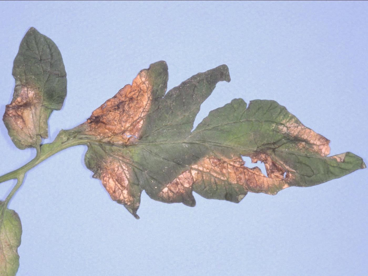 Description: La face supérieure des folioles de tomate de serre montre des zones irrégulières qui étaient initialement blanches et qui sont devenues brunes par la suite. La délimitation nette observée entre les tissus affectés et les tissus sains laisse supposer que les tissus verts étaient cachés par une autre foliole. Ce patron est généralement observé lorsque les feuilles subissent de l’insolation (coup de soleil).