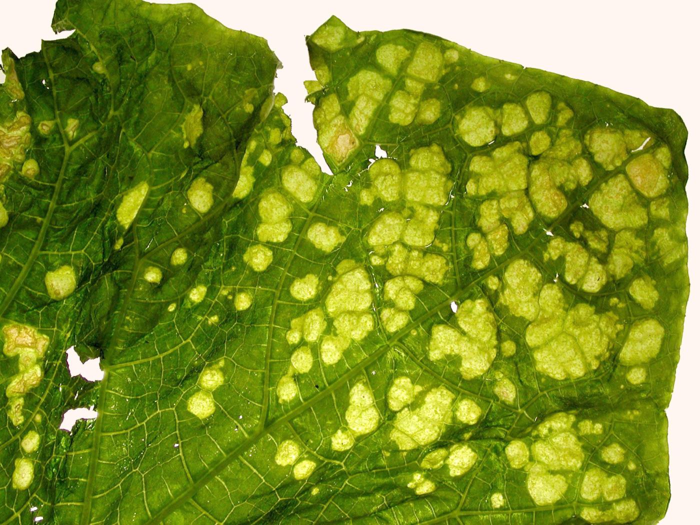 Légende: Protubérances sur feuille de concombre